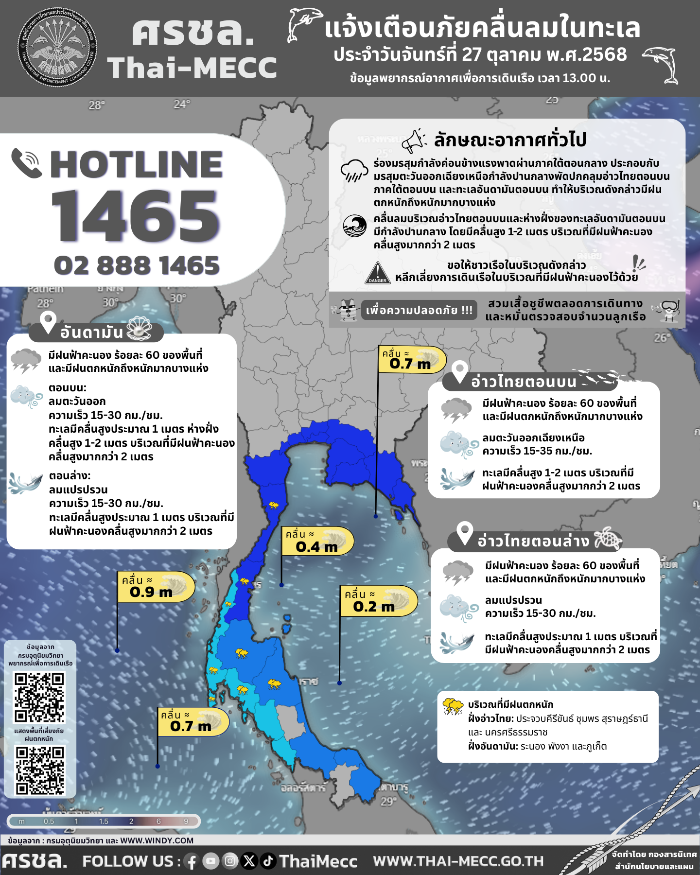 ประกาศ ศูนย์อำนวยการรักษาผลประโยชน์ของชาติทางทะเล เรื่อง แจ้งเตือนภัยคลื่นลมในทะเล ประจำวันจันทร์ที่ 27 ตุลาคม 2568