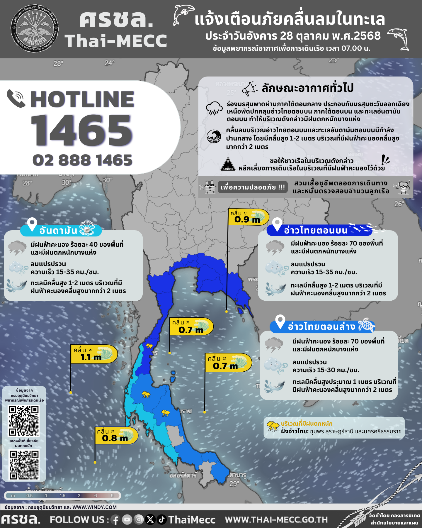 ประกาศ ศูนย์อำนวยการรักษาผลประโยชน์ของชาติทางทะเล เรื่อง แจ้งเตือนภัยคลื่นลมในทะเล ประจำวันอังคารที่ 28 ตุลาคม 2568