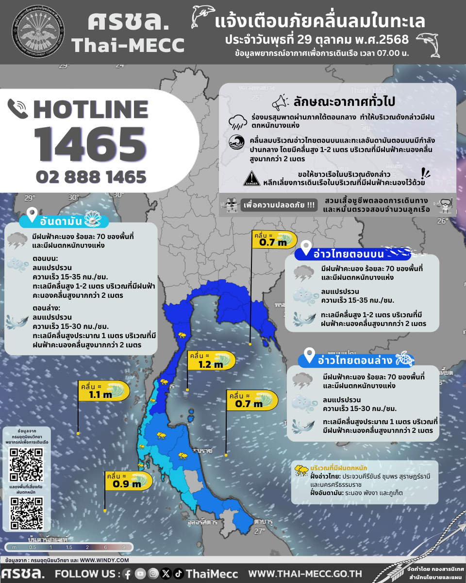 ประกาศ ศูนย์อำนวยการรักษาผลประโยชน์ของชาติทางทะเล เรื่อง แจ้งเตือนภัยคลื่นลมในทะเล ประจำวันพุธที่ 29 ตุลาคม 2568