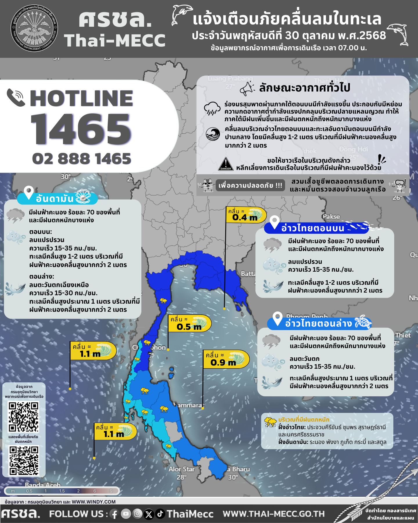 ประกาศ ศูนย์อำนวยการรักษาผลประโยชน์ของชาติทางทะเล เรื่อง แจ้งเตือนภัยคลื่นลมในทะเล ประจำวันพฤหัสบดีที่ 30 ตุลาคม 2568