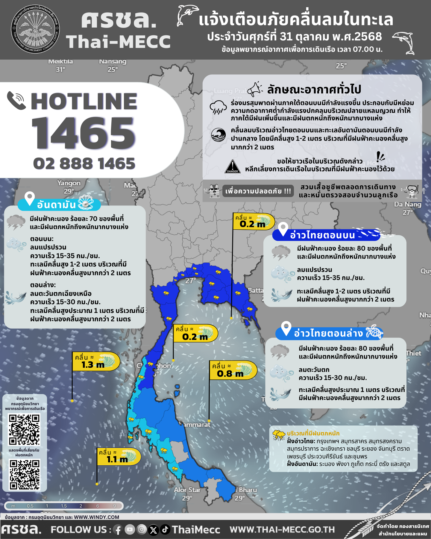 ประกาศ ศูนย์อำนวยการรักษาผลประโยชน์ของชาติทางทะเล เรื่อง แจ้งเตือนภัยคลื่นลมในทะเล ประจำวันศุกร์ที่ 31 ตุลาคม 2568