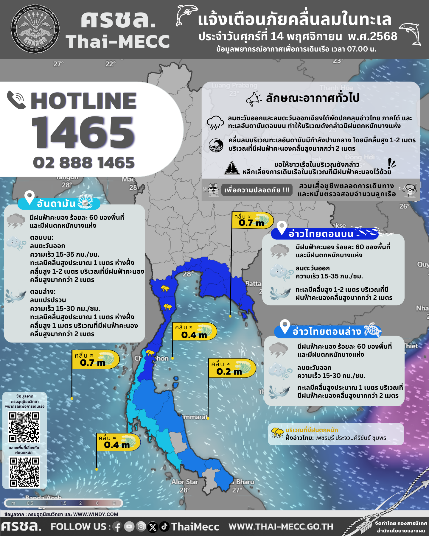 ประกาศ ศูนย์อำนวยการรักษาผลประโยชน์ของชาติทางทะเล เรื่อง แจ้งเตือนภัยคลื่นลมในทะเล ประจำวันศุกร์ที่ 14 พฤศจิกายน 2568