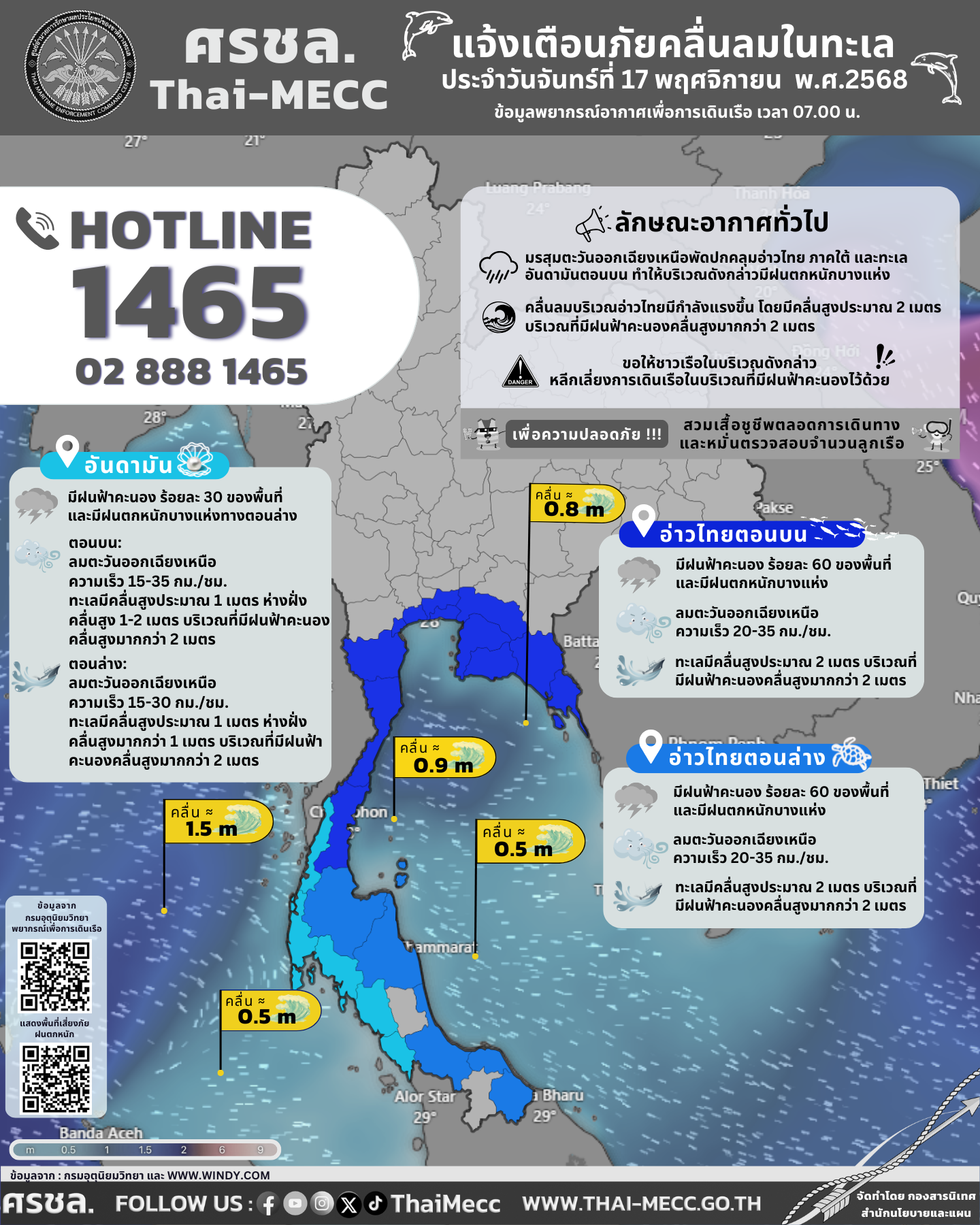 ประกาศ ศูนย์อำนวยการรักษาผลประโยชน์ของชาติทางทะเล เรื่อง แจ้งเตือนภัยคลื่นลมในทะเล ประจำวันจันทร์ที่ 17 พฤศจิกายน 2568