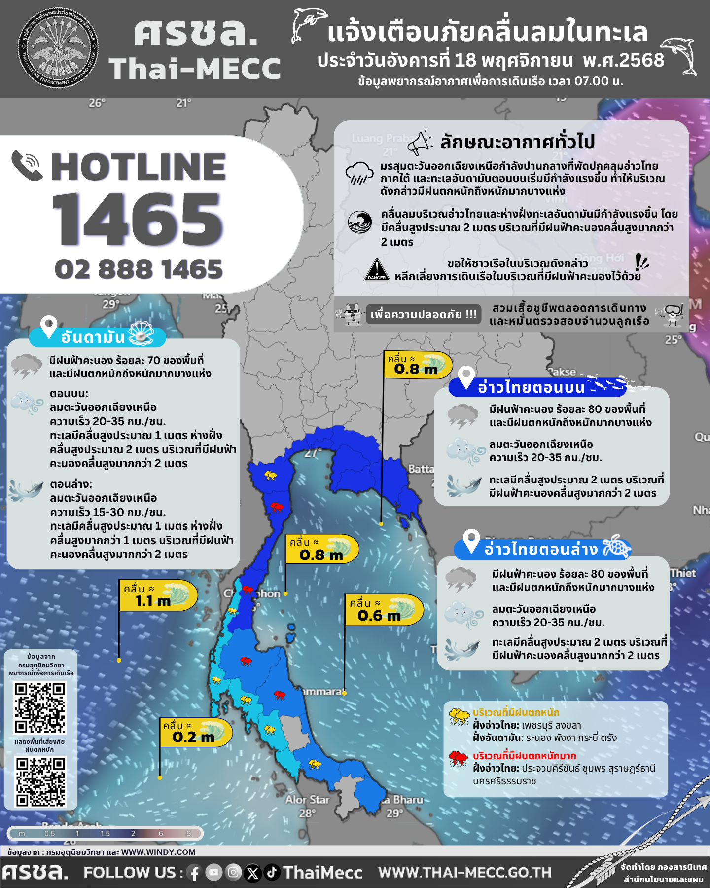 ประกาศ ศูนย์อำนวยการรักษาผลประโยชน์ของชาติทางทะเล เรื่อง แจ้งเตือนภัยคลื่นลมในทะเล ประจำวันอังคารที่ 18 พฤศจิกายน 2568