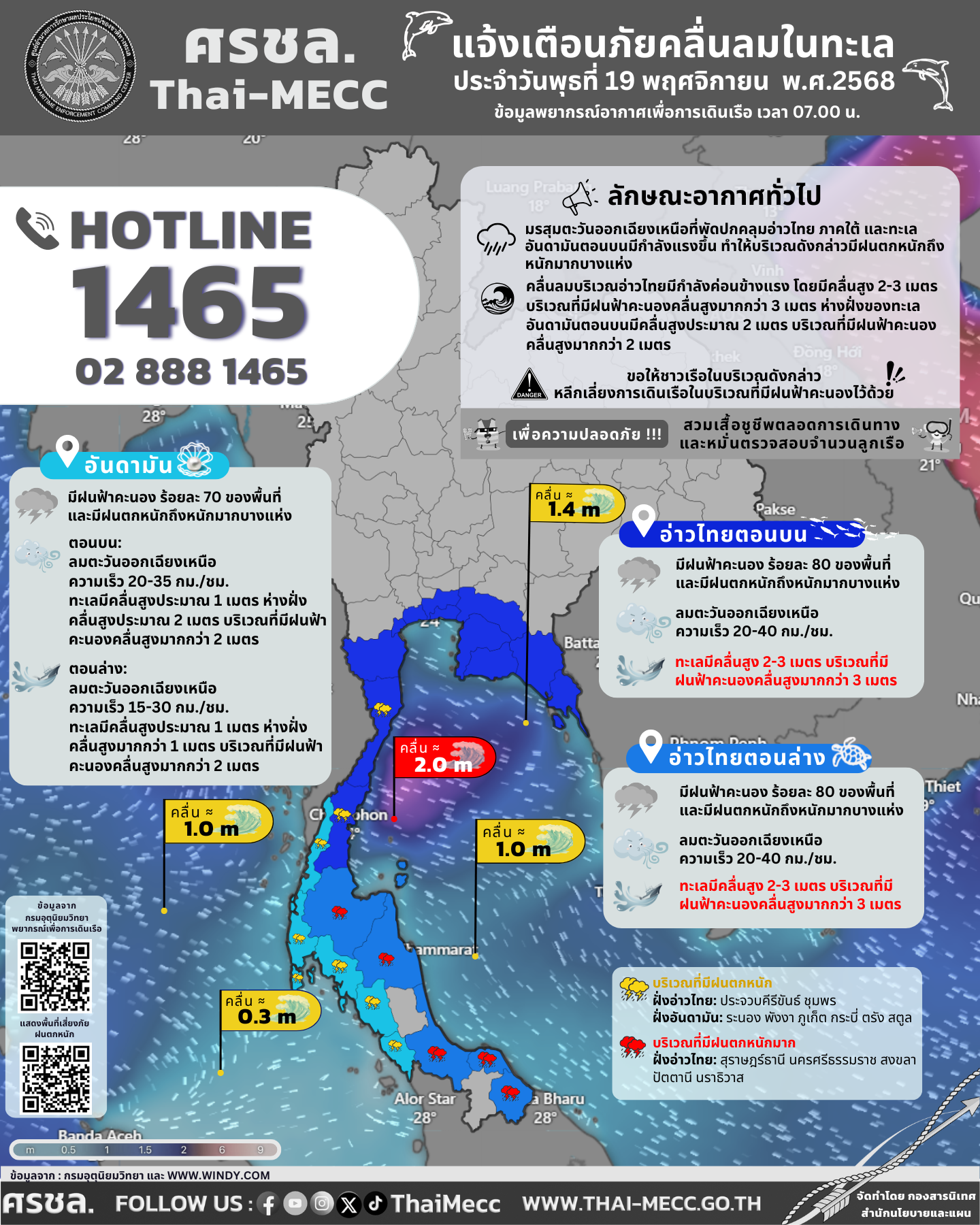 ประกาศ ศูนย์อำนวยการรักษาผลประโยชน์ของชาติทางทะเล เรื่อง แจ้งเตือนภัยคลื่นลมในทะเล ประจำวันพุธที่ 19 พฤศจิกายน 2568