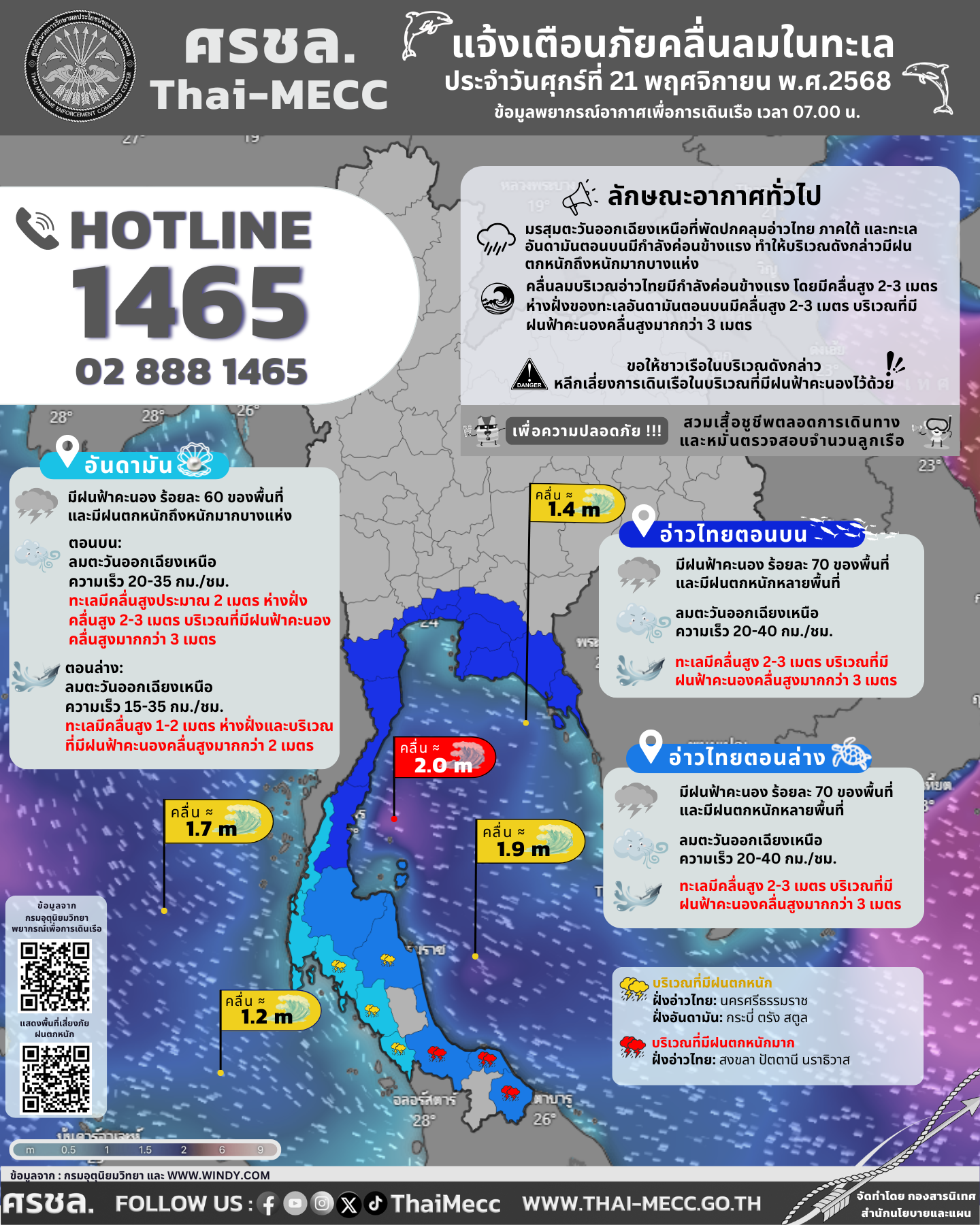 ประกาศ ศูนย์อำนวยการรักษาผลประโยชน์ของชาติทางทะเล เรื่อง แจ้งเตือนภัยคลื่นลมในทะเล ประจำวันศุกร์ที่ 21 พฤศจิกายน 2568