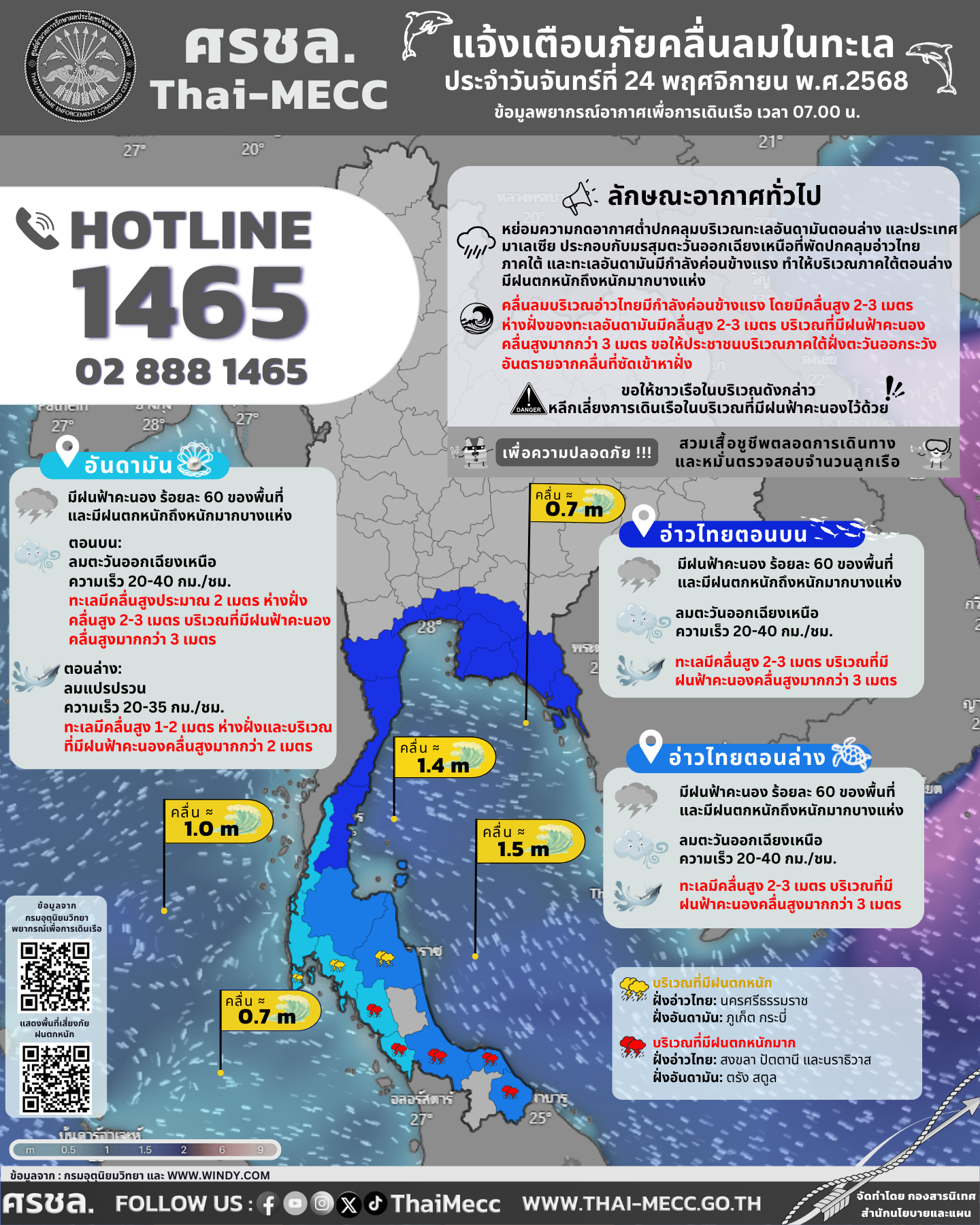 ประกาศ ศูนย์อำนวยการรักษาผลประโยชน์ของชาติทางทะเล เรื่อง แจ้งเตือนภัยคลื่นลมในทะเล ประจำวันจันทร์ที่ 24 พฤศจิกายน 2568