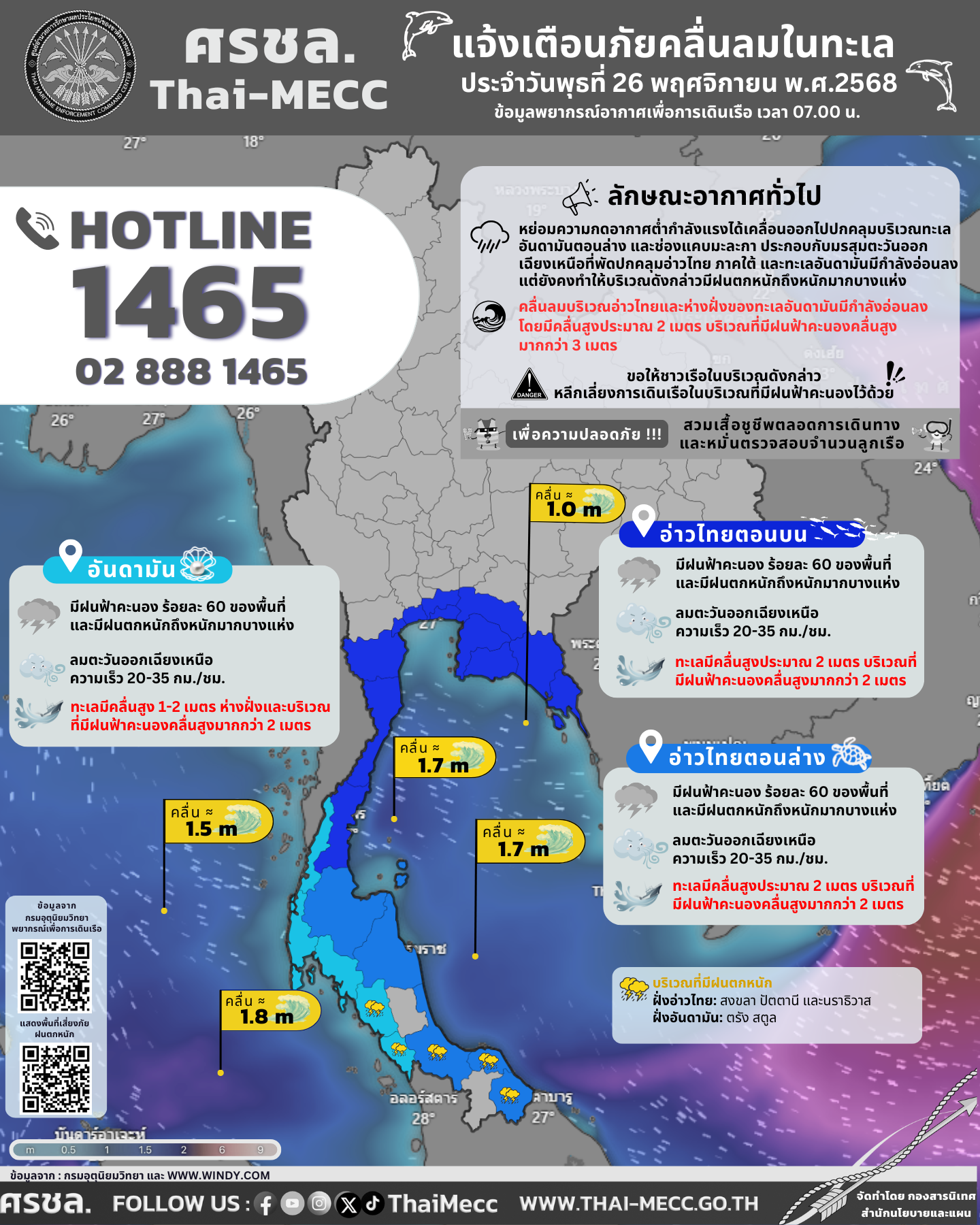 ประกาศ ศูนย์อำนวยการรักษาผลประโยชน์ของชาติทางทะเล เรื่อง แจ้งเตือนภัยคลื่นลมในทะเล ประจำวันพุธที่ 26 พฤศจิกายน 2568