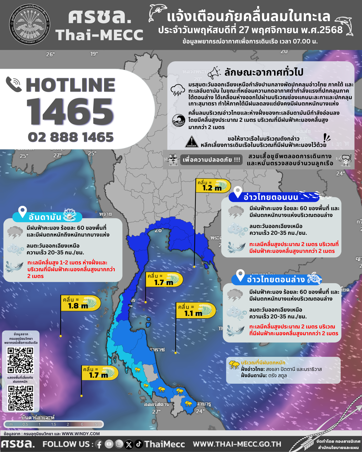 ประกาศ ศูนย์อำนวยการรักษาผลประโยชน์ของชาติทางทะเล เรื่อง แจ้งเตือนภัยคลื่นลมในทะเล ประจำวันพฤหัสบดีที่ 27 พฤศจิกายน 2568