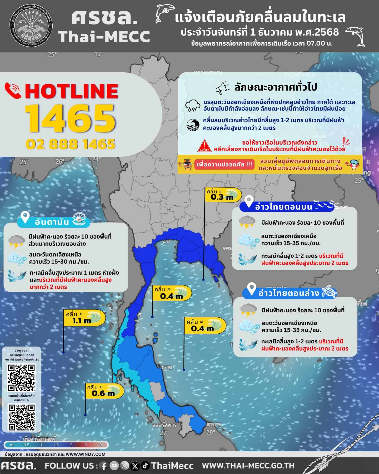 ประกาศ ศูนย์อำนวยการรักษาผลประโยชน์ของชาติทางทะเล เรื่อง แจ้งเตือนภัยคลื่นลมในทะเล ประจำวันจันทร์ที่ 1 ธันวาคม 2568