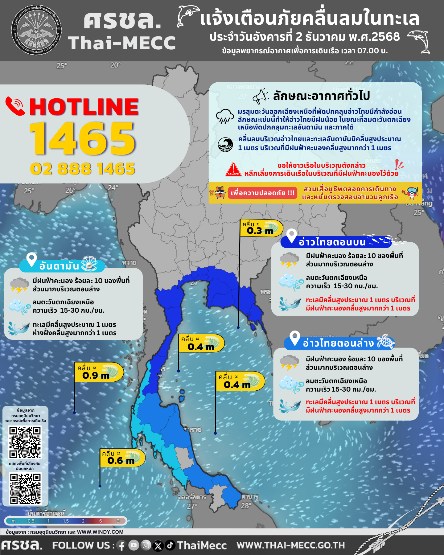 ประกาศ ศูนย์อำนวยการรักษาผลประโยชน์ของชาติทางทะเล เรื่อง แจ้งเตือนภัยคลื่นลมในทะเล ประจำวันอังคารที่ 2 ธันวาคม 2568