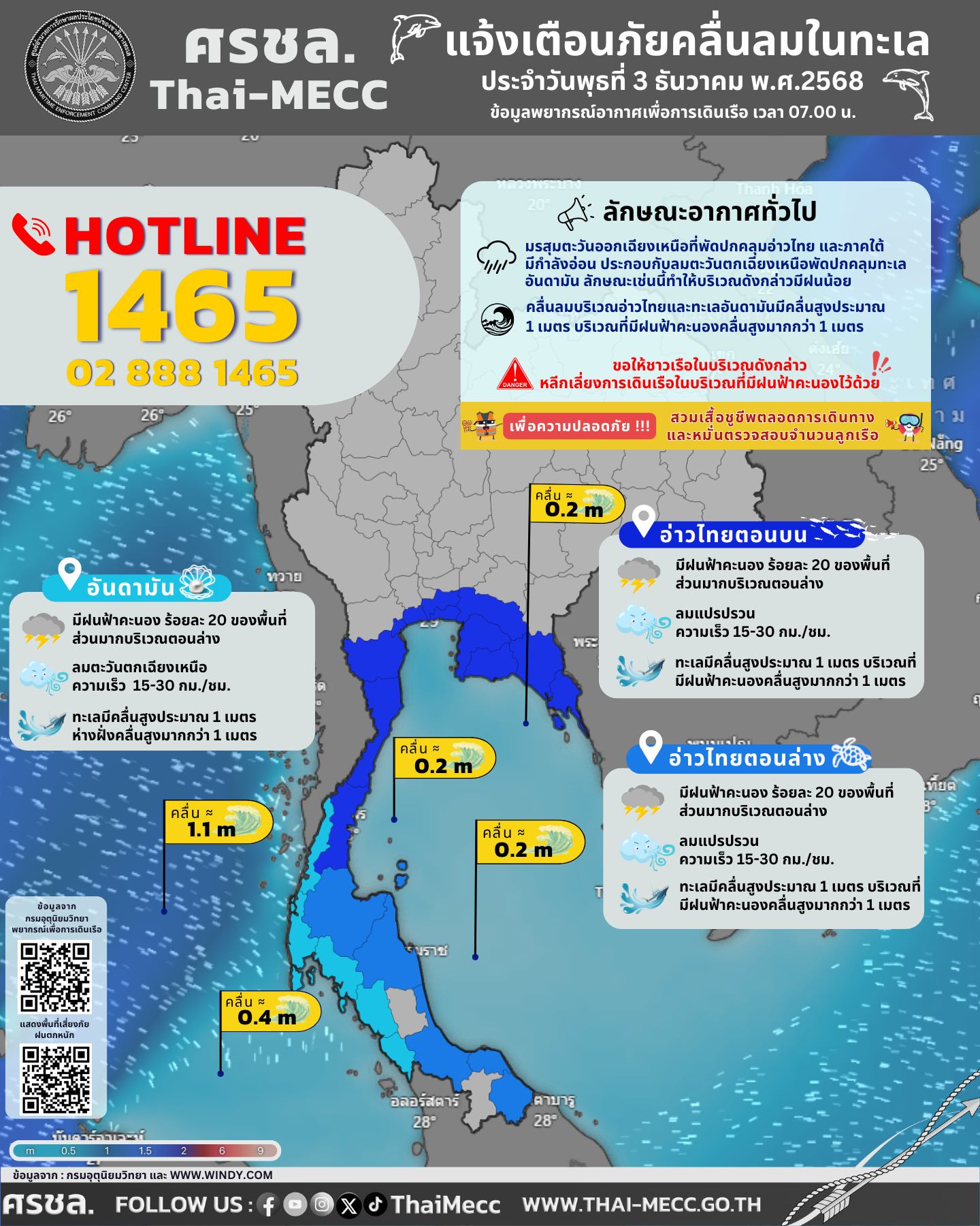 ประกาศ ศูนย์อำนวยการรักษาผลประโยชน์ของชาติทางทะเล เรื่อง แจ้งเตือนภัยคลื่นลมในทะเล ประจำวันพุธที่ 3 ธันวาคม 2568