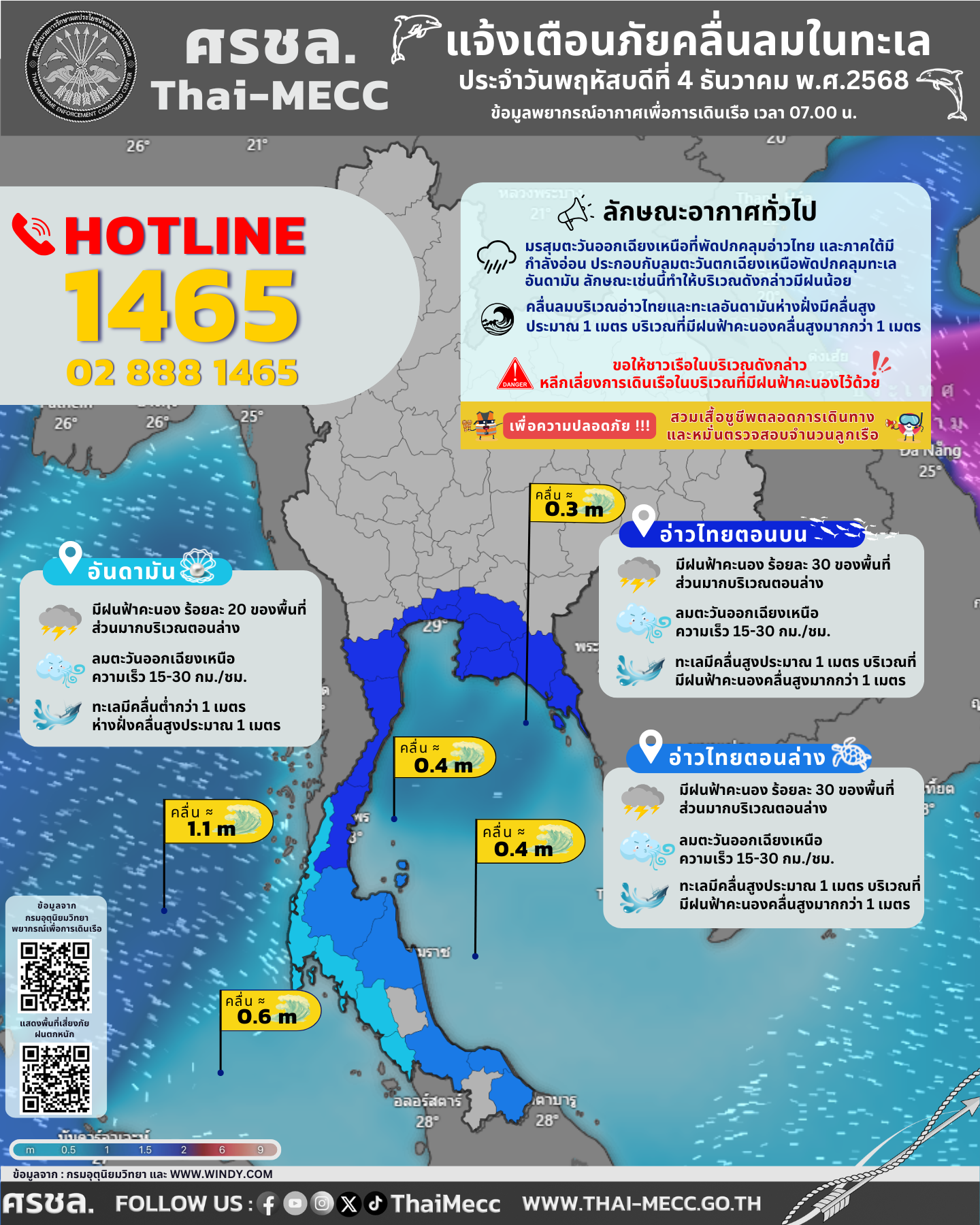 ประกาศ ศูนย์อำนวยการรักษาผลประโยชน์ของชาติทางทะเล เรื่อง แจ้งเตือนภัยคลื่นลมในทะเล ประจำวันพฤหัสบดีที่ 4 ธันวาคม 2568