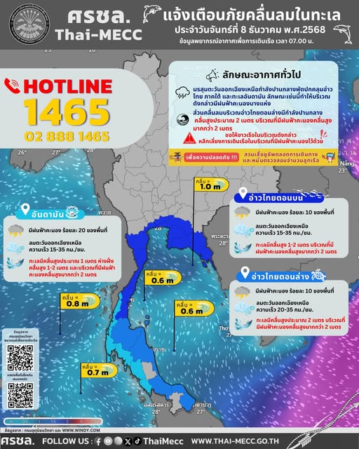 ประกาศ ศูนย์อำนวยการรักษาผลประโยชน์ของชาติทางทะเล เรื่อง แจ้งเตือนภัยคลื่นลมในทะเล ประจำวันจันทร์ที่ 8 ธันวาคม 2568