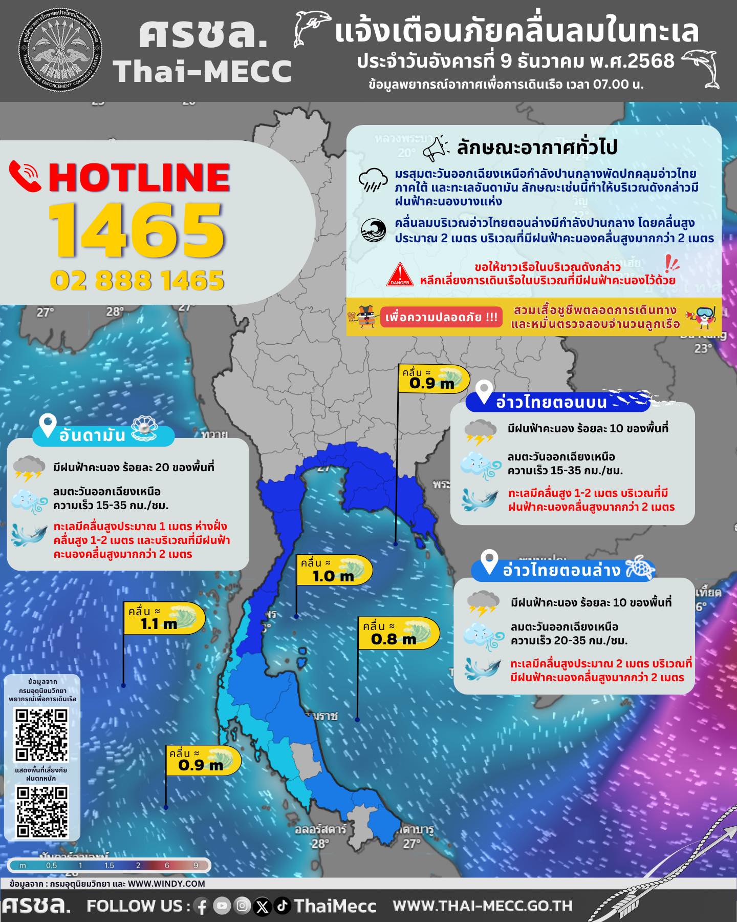 ประกาศ ศูนย์อำนวยการรักษาผลประโยชน์ของชาติทางทะเล เรื่อง แจ้งเตือนภัยคลื่นลมในทะเล ประจำวันอังคารที่ 9 ธันวาคม 2568