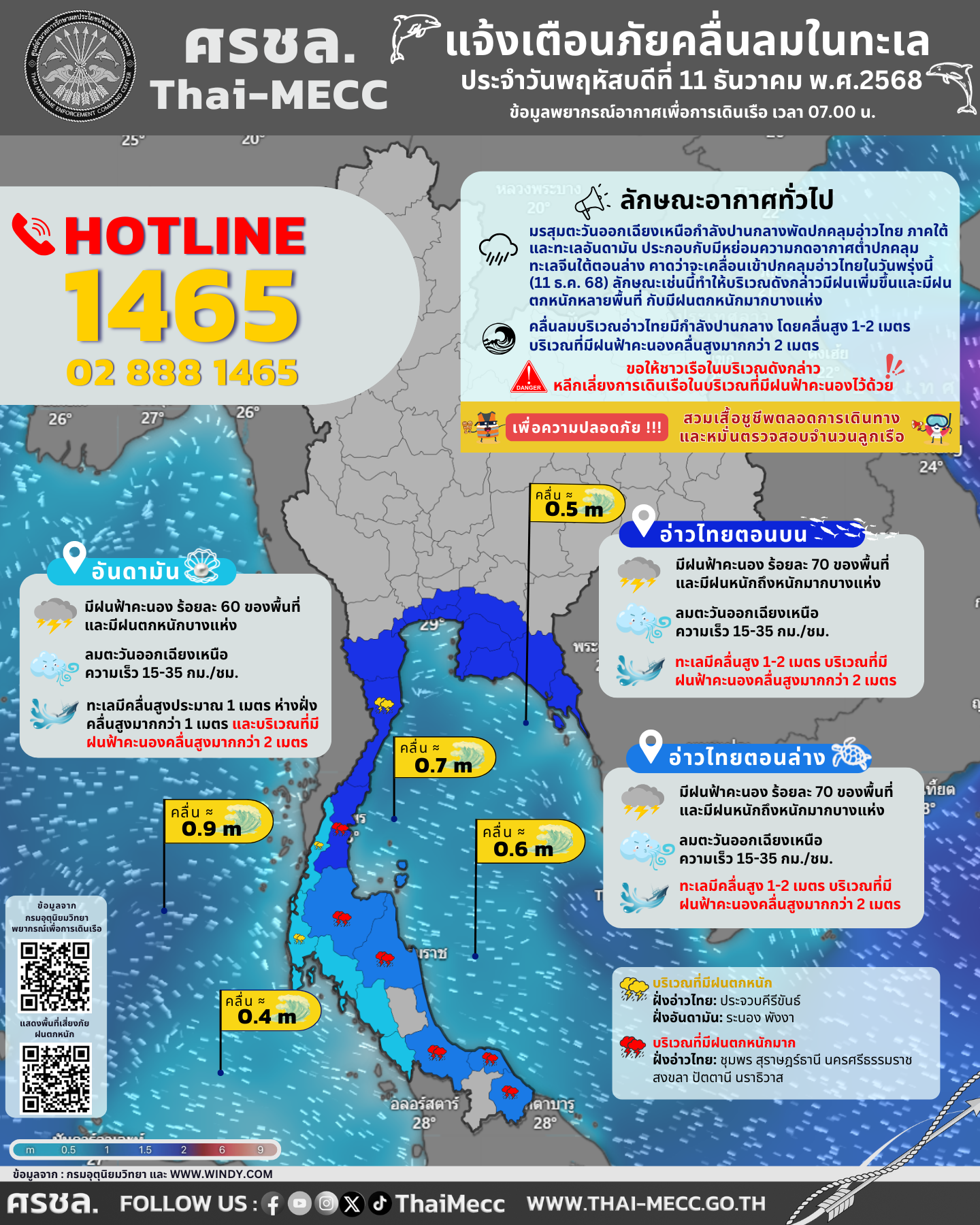 ประกาศ ศูนย์อำนวยการรักษาผลประโยชน์ของชาติทางทะเล เรื่อง แจ้งเตือนภัยคลื่นลมในทะเล ประจำวันพฤหัสบดีที่ 11 ธันวาคม 2568