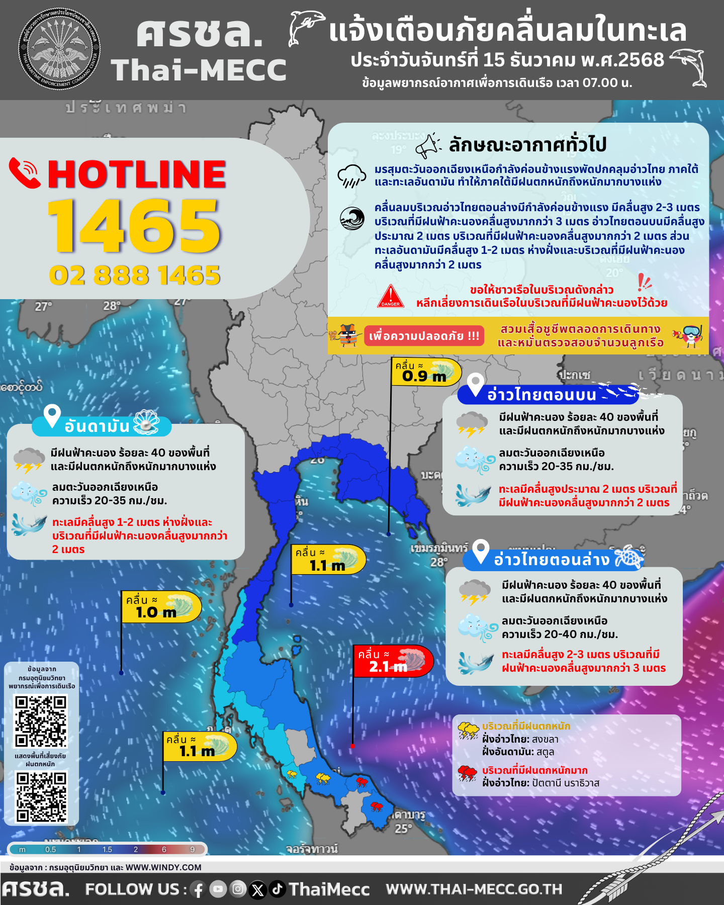 ประกาศ ศูนย์อำนวยการรักษาผลประโยชน์ของชาติทางทะเล เรื่อง แจ้งเตือนภัยคลื่นลมในทะเล ประจำวันจันทร์ที่ 15 ธันวาคม 2568