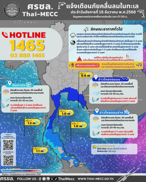 ประกาศ ศูนย์อำนวยการรักษาผลประโยชน์ของชาติทางทะเล เรื่อง แจ้งเตือนภัยคลื่นลมในทะเล ประจำวันอังคารที่ 16 ธันวาคม 2568