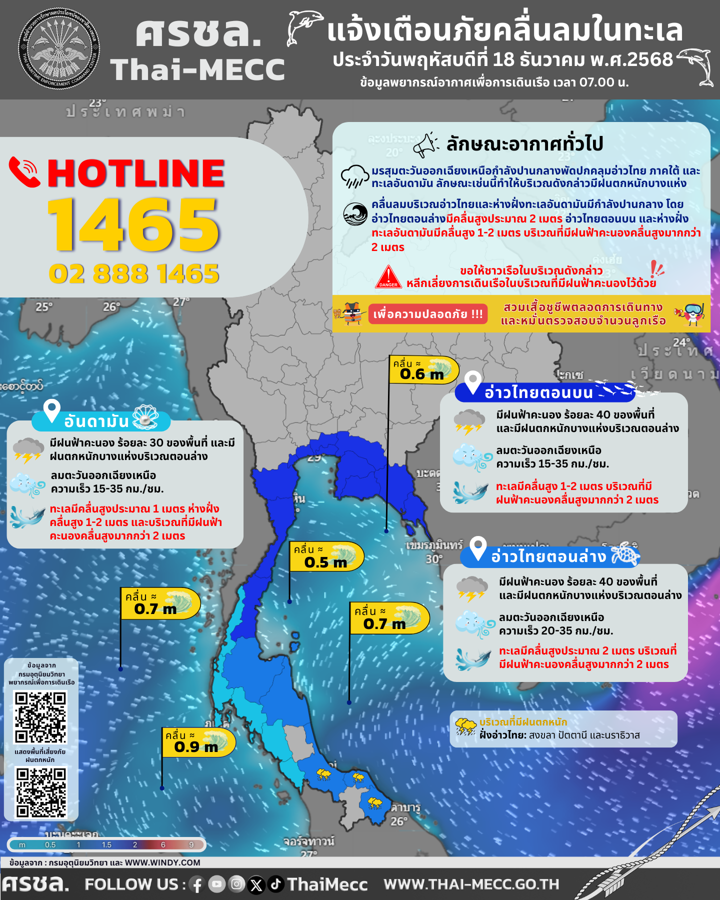ประกาศ ศูนย์อำนวยการรักษาผลประโยชน์ของชาติทางทะเล เรื่อง แจ้งเตือนภัยคลื่นลมในทะเล ประจำวันพฤหัสบดีที่ 18 ธันวาคม 2568