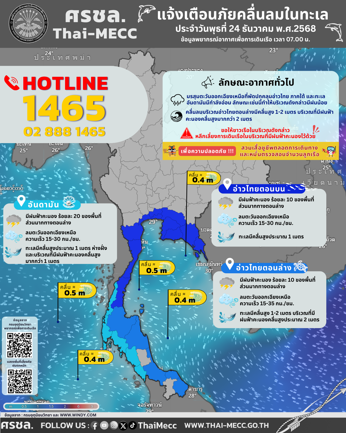 ประกาศ ศูนย์อำนวยการรักษาผลประโยชน์ของชาติทางทะเล เรื่อง แจ้งเตือนภัยคลื่นลมในทะเล ประจำวันพุธที่ 24 ธันวาคม 2568