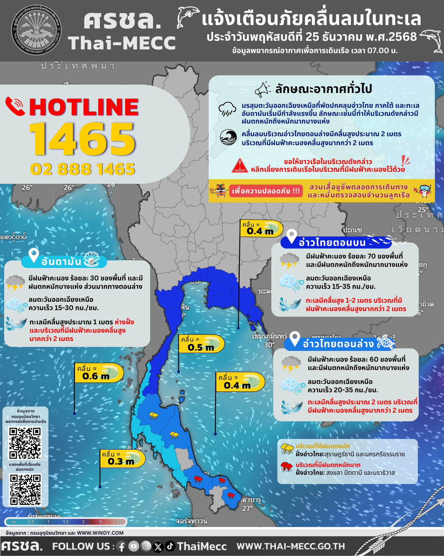 ประกาศ ศูนย์อำนวยการรักษาผลประโยชน์ของชาติทางทะเล เรื่อง แจ้งเตือนภัยคลื่นลมในทะเล ประจำวันพฤหัสบดีที่ 25 ธันวาคม 2568