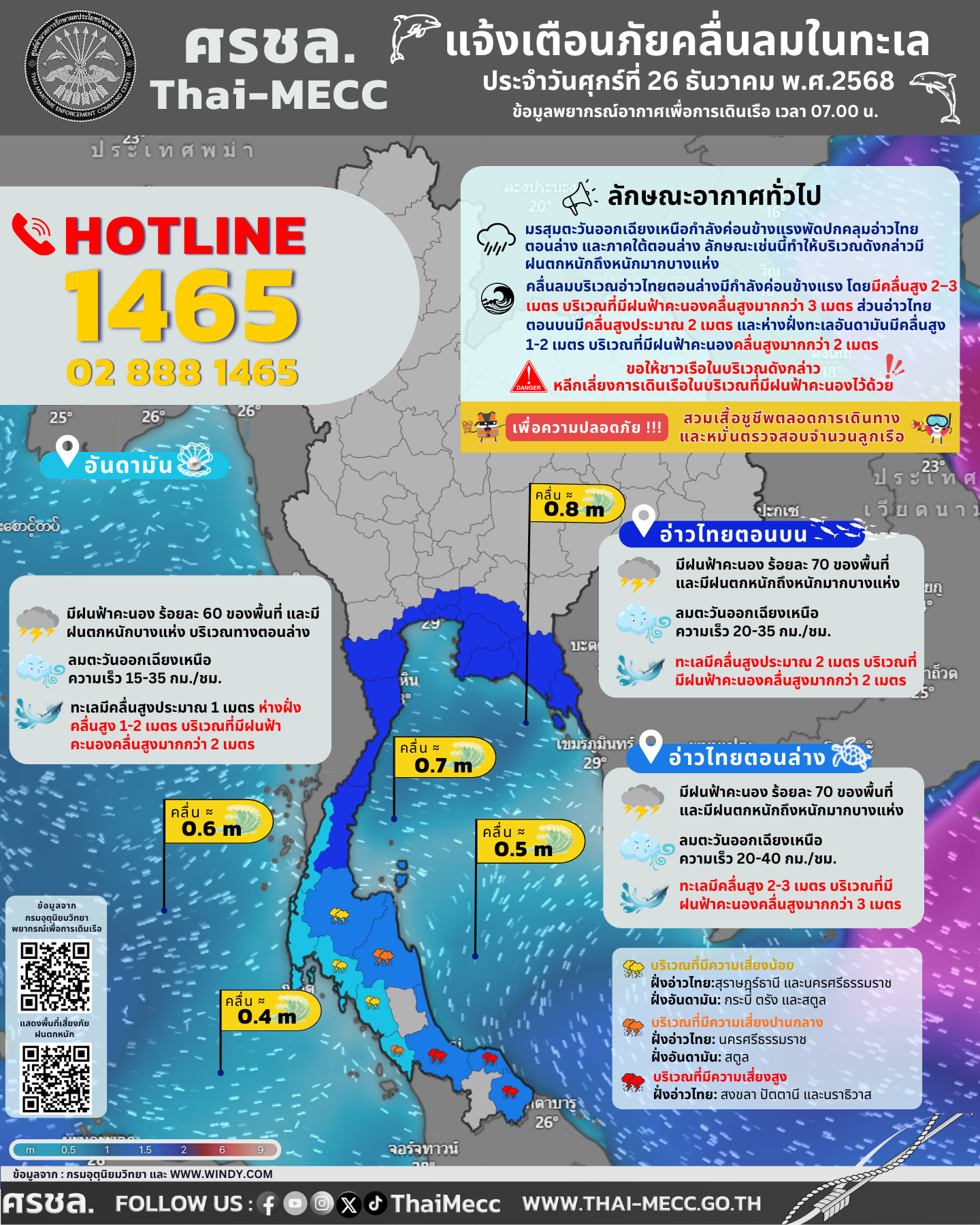 ประกาศ ศูนย์อำนวยการรักษาผลประโยชน์ของชาติทางทะเล เรื่อง แจ้งเตือนภัยคลื่นลมในทะเล ประจำวันศุกร์ที่ 26 ธันวาคม 2568
