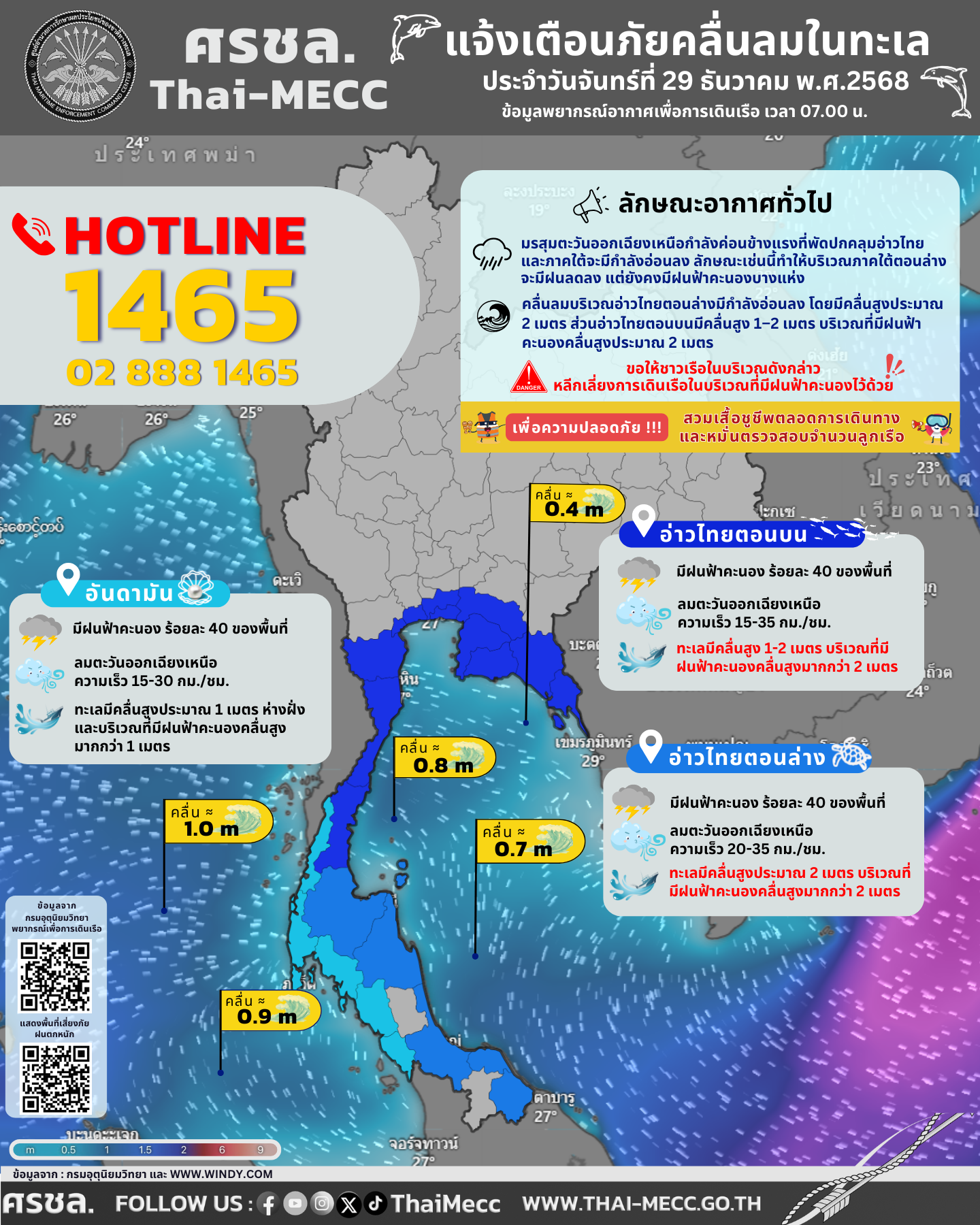 ประกาศ ศูนย์อำนวยการรักษาผลประโยชน์ของชาติทางทะเล เรื่อง แจ้งเตือนภัยคลื่นลมในทะเล ประจำวันจันทร์ที่ 29 ธันวาคม 2568