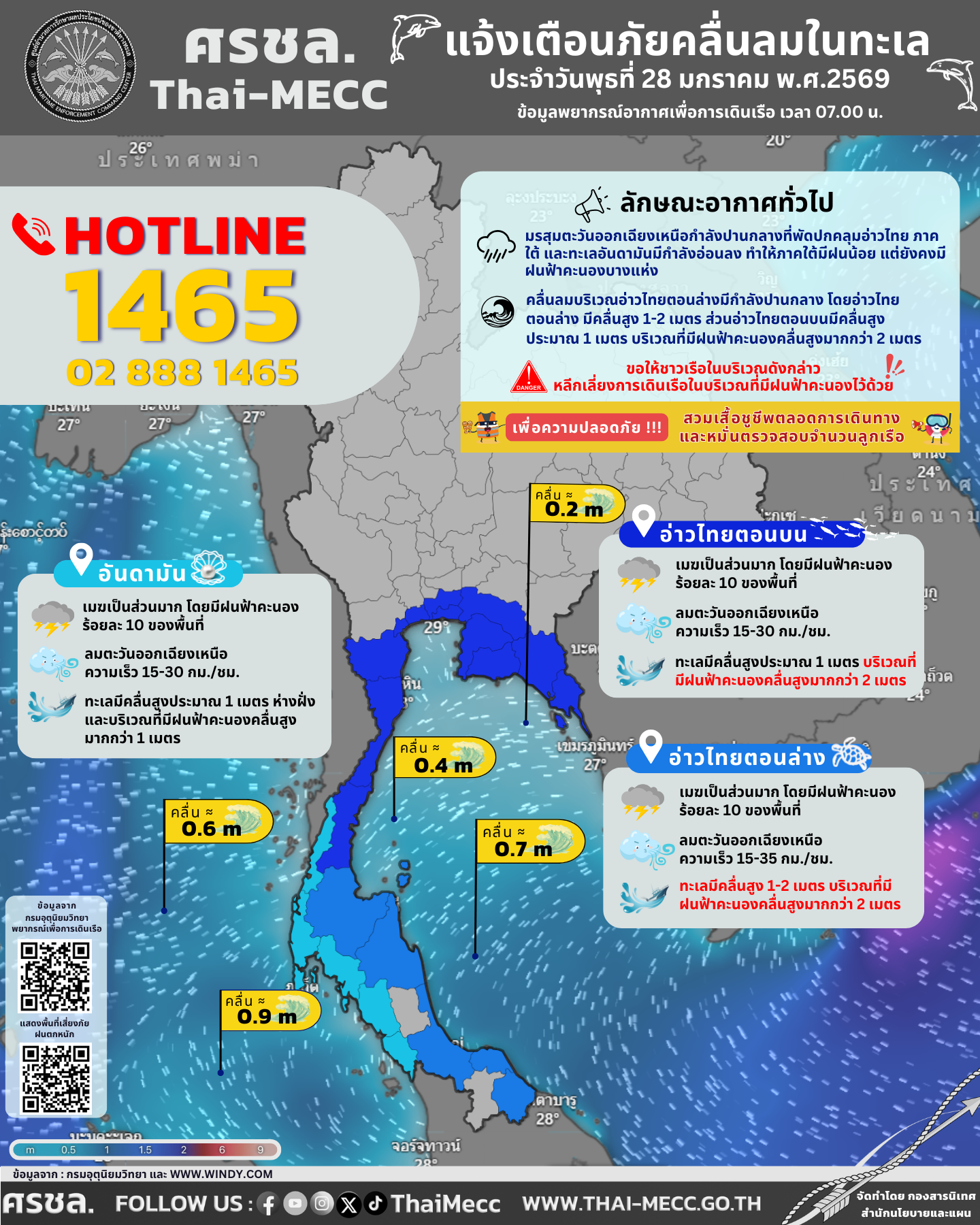 ประกาศ ศูนย์อำนวยการรักษาผลประโยชน์ของชาติทางทะเล เรื่อง แจ้งเตือนภัยคลื่นลมในทะเล ประจำวันพุธที่ 28 มกราคม 2569