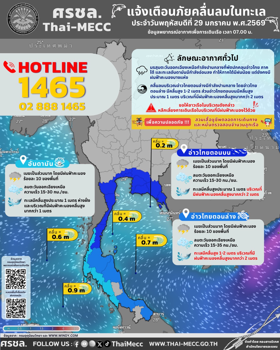 ประกาศ ศูนย์อำนวยการรักษาผลประโยชน์ของชาติทางทะเล เรื่อง แจ้งเตือนภัยคลื่นลมในทะเล ประจำวันพฤหัสบดีที่ 29 มกราคม 2569