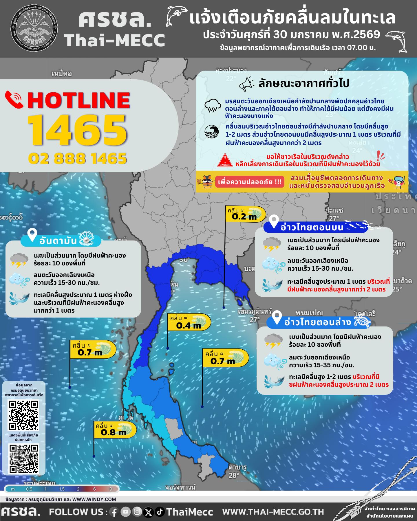 ประกาศ ศูนย์อำนวยการรักษาผลประโยชน์ของชาติทางทะเล เรื่อง แจ้งเตือนภัยคลื่นลมในทะเล ประจำวันศุกร์ที่ 30 มกราคม 2569