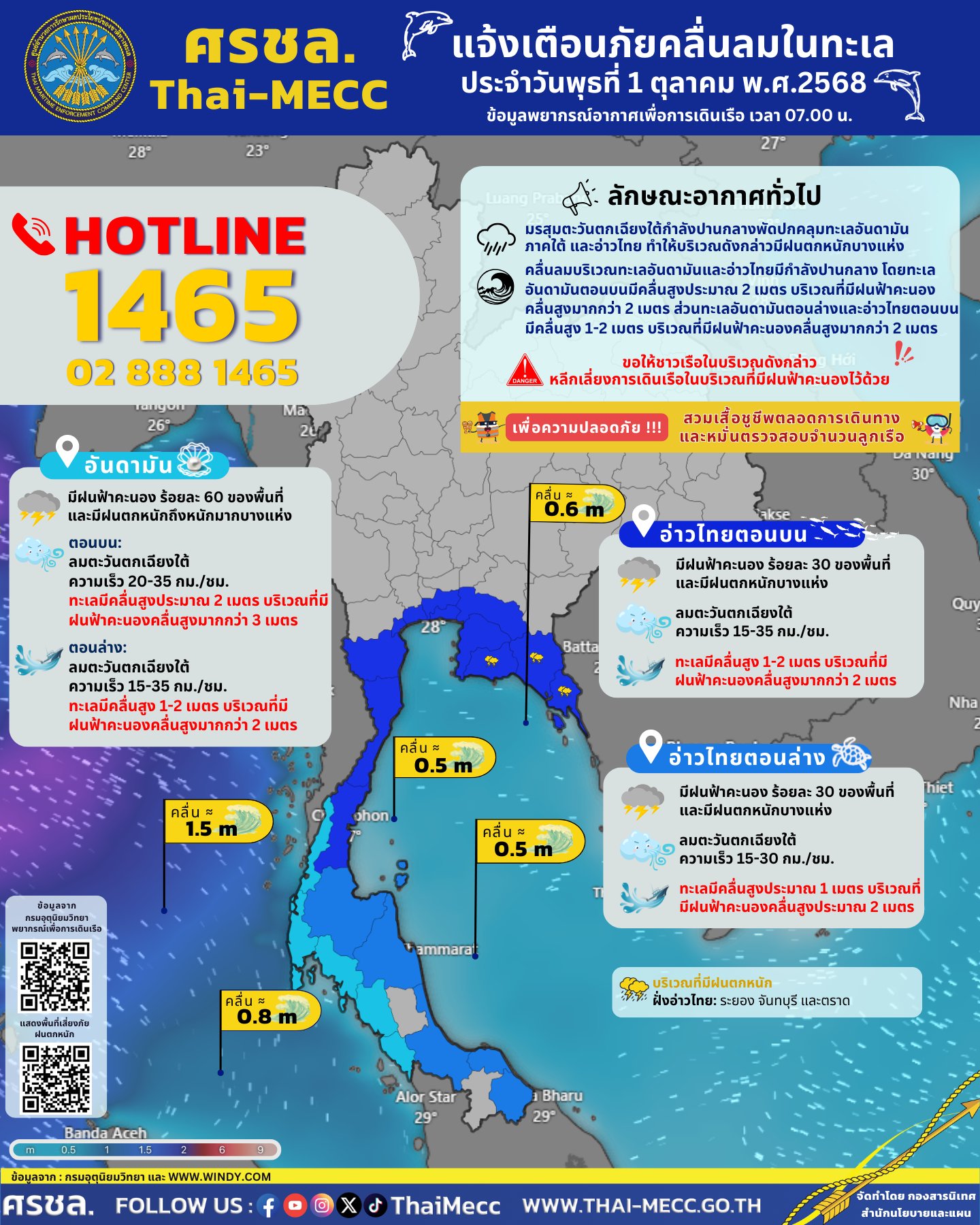 ประกาศ ศูนย์อำนวยการรักษาผลประโยชน์ของชาติทางทะเล เรื่อง แจ้งเตือนภัยคลื่นลมในทะเล ประจำวันพุธที่ 1 ตุลาคม 2568