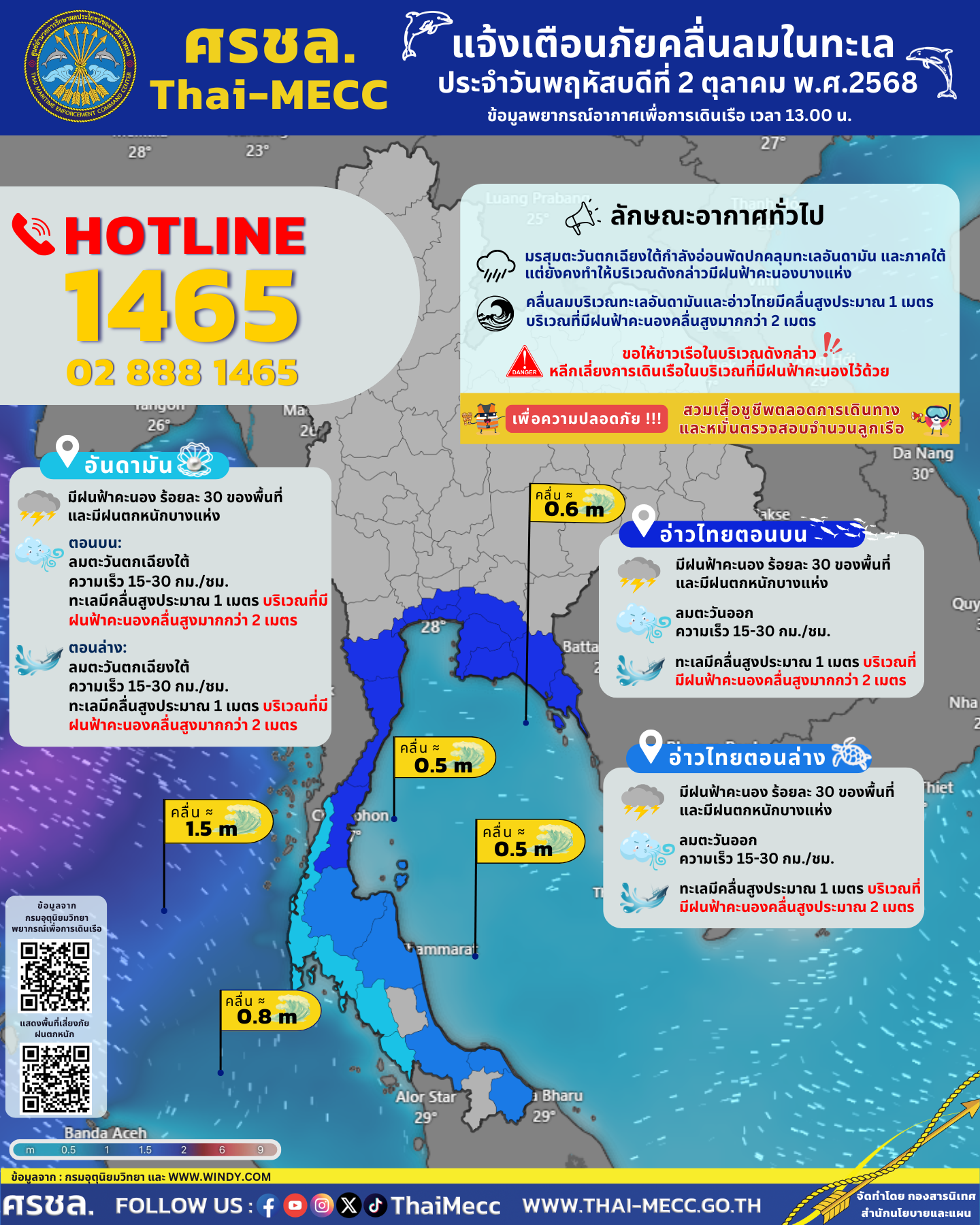 ประกาศ ศูนย์อำนวยการรักษาผลประโยชน์ของชาติทางทะเล เรื่อง แจ้งเตือนภัยคลื่นลมในทะเล ประจำวันพฤหัสบดีที่ 2 ตุลาคม 2568