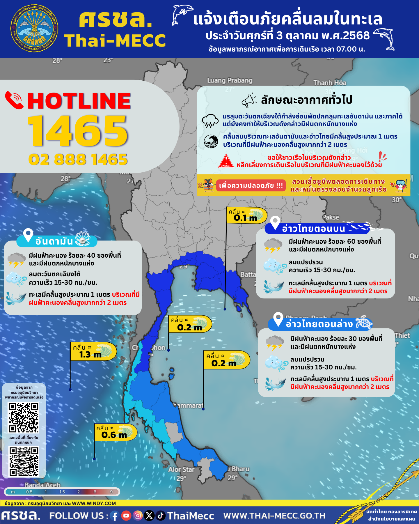 ประกาศ ศูนย์อำนวยการรักษาผลประโยชน์ของชาติทางทะเล เรื่อง แจ้งเตือนภัยคลื่นลมในทะเล ประจำวันศุกร์ที่ 3 ตุลาคม 2568