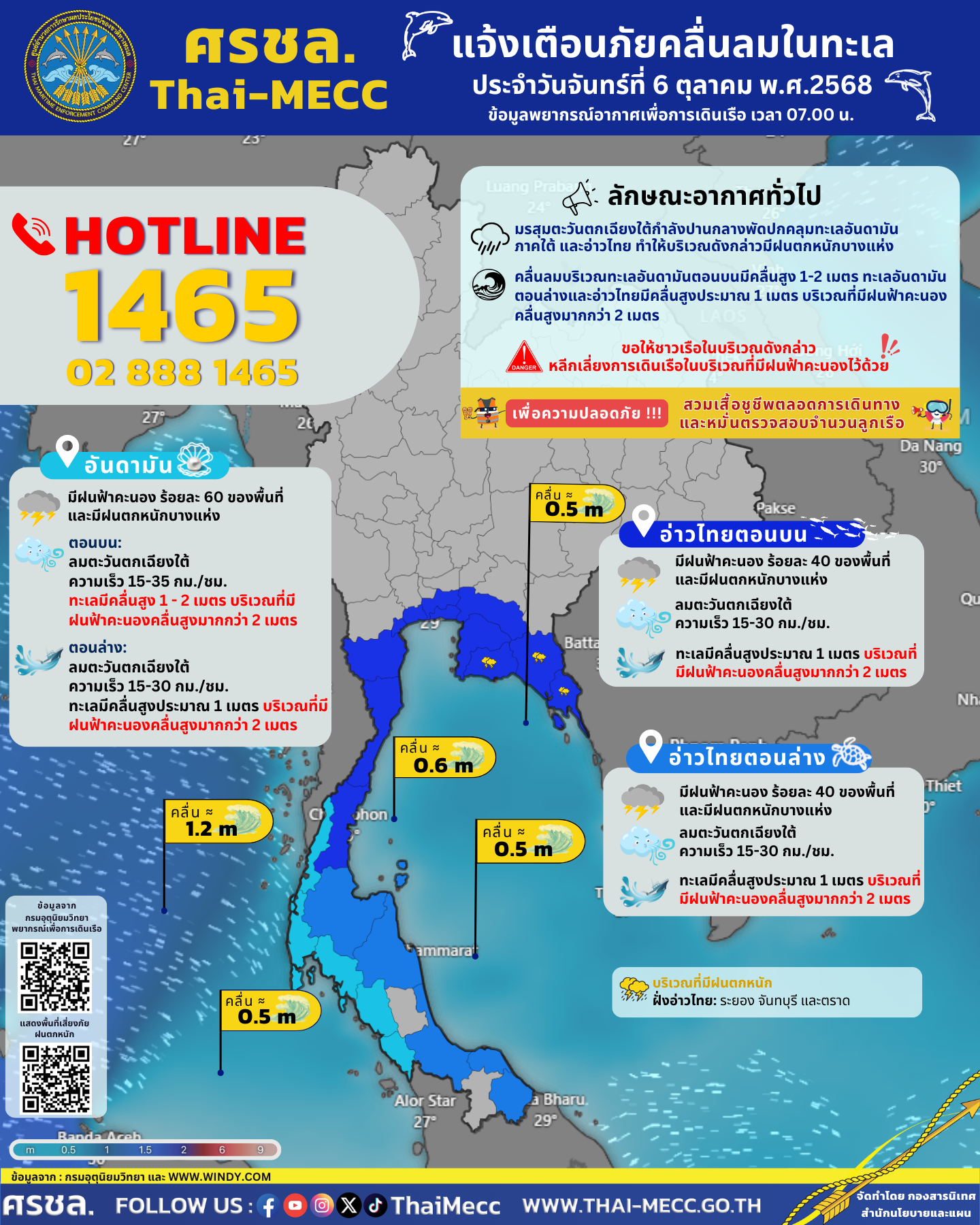 ประกาศ ศูนย์อำนวยการรักษาผลประโยชน์ของชาติทางทะเล เรื่อง แจ้งเตือนภัยคลื่นลมในทะเล ประจำวันจันทร์ที่ 6 ตุลาคม 2568