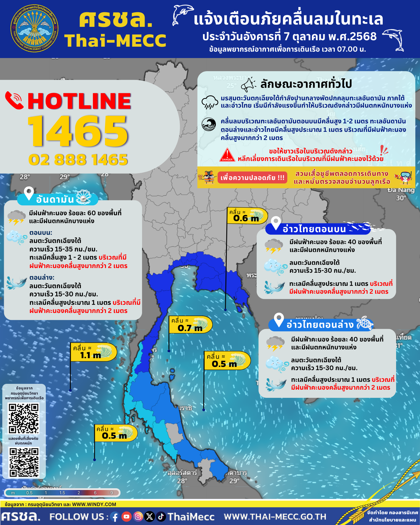 ประกาศ ศูนย์อำนวยการรักษาผลประโยชน์ของชาติทางทะเล เรื่อง แจ้งเตือนภัยคลื่นลมในทะเล ประจำวันอังคารที่ 7 ตุลาคม 2568