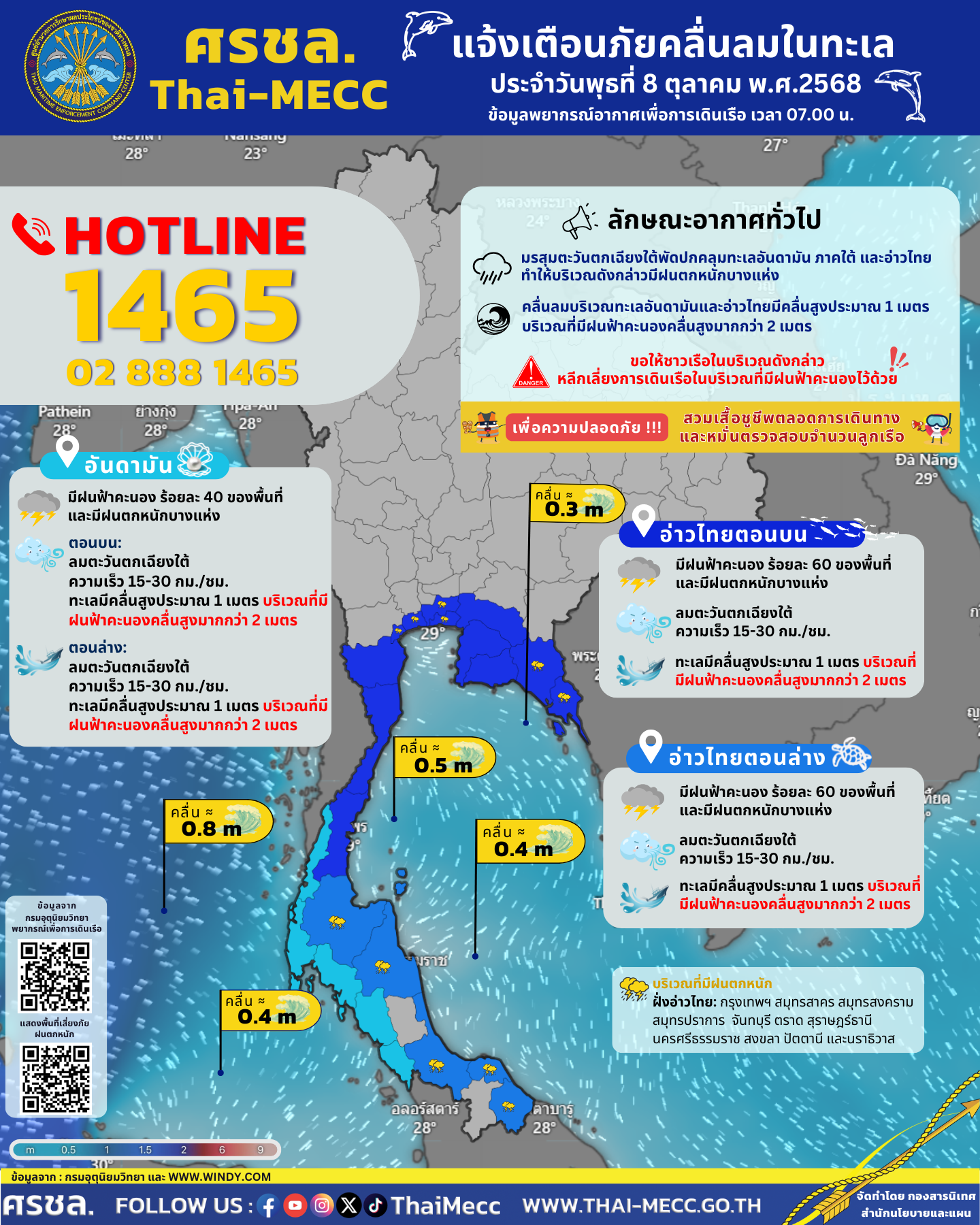ประกาศ ศูนย์อำนวยการรักษาผลประโยชน์ของชาติทางทะเล เรื่อง แจ้งเตือนภัยคลื่นลมในทะเล ประจำวันพุธที่ 8 ตุลาคม 2568