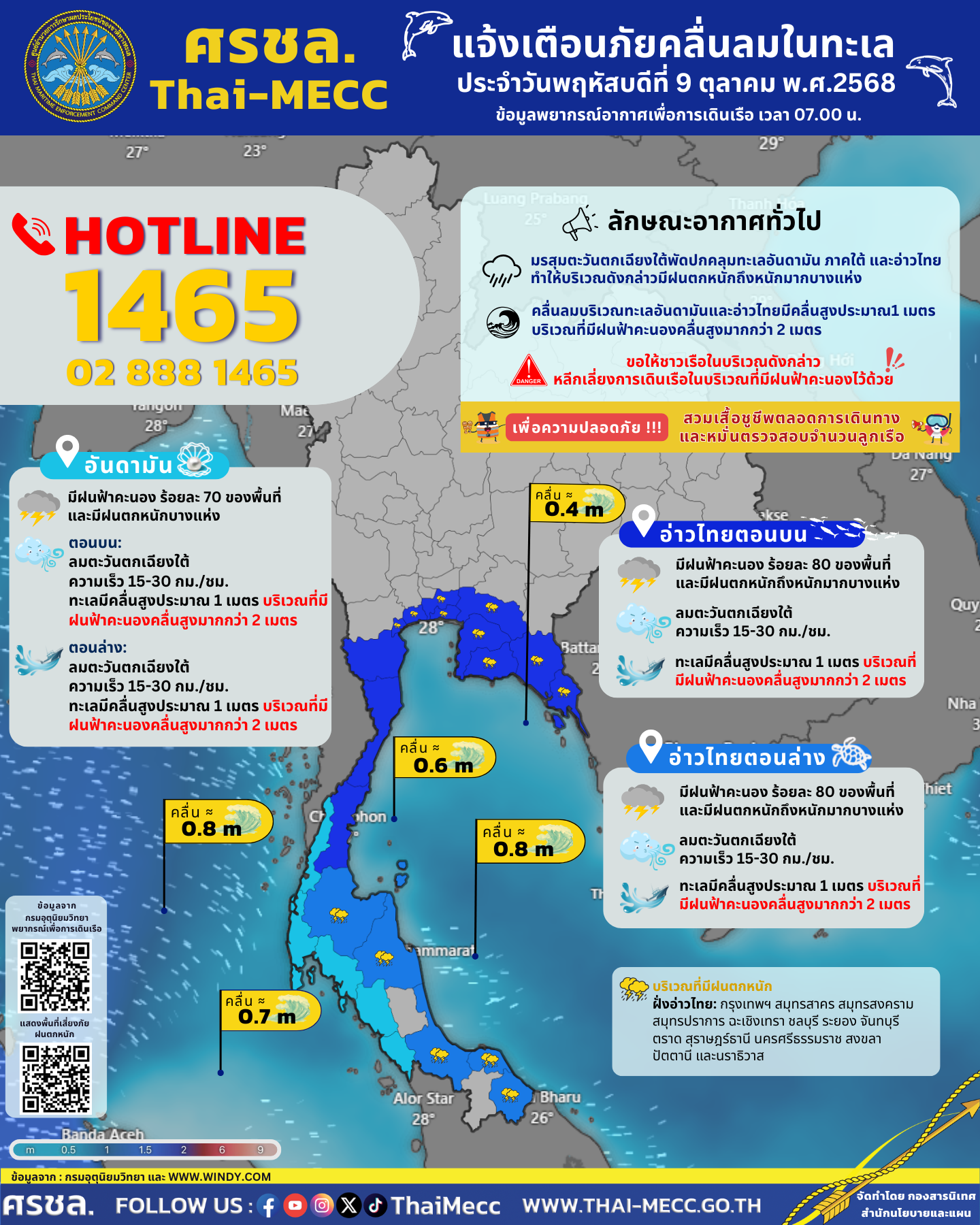 ประกาศ ศูนย์อำนวยการรักษาผลประโยชน์ของชาติทางทะเล เรื่อง แจ้งเตือนภัยคลื่นลมในทะเล ประจำวันพฤหัสบดีที่ 9 ตุลาคม 2568