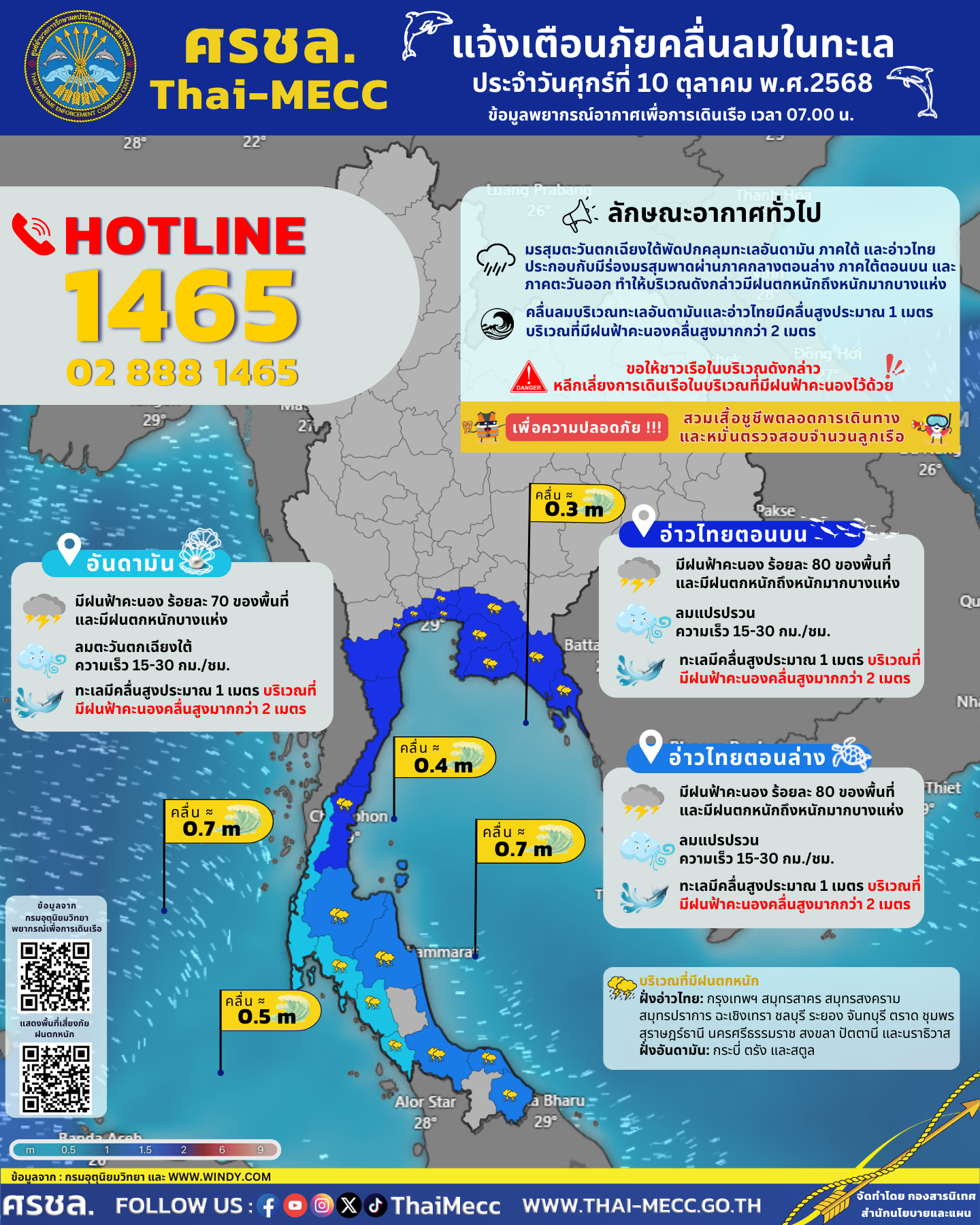 ประกาศ ศูนย์อำนวยการรักษาผลประโยชน์ของชาติทางทะเล เรื่อง แจ้งเตือนภัยคลื่นลมในทะเล ประจำวันศุกร์ที่ 10 ตุลาคม 2568