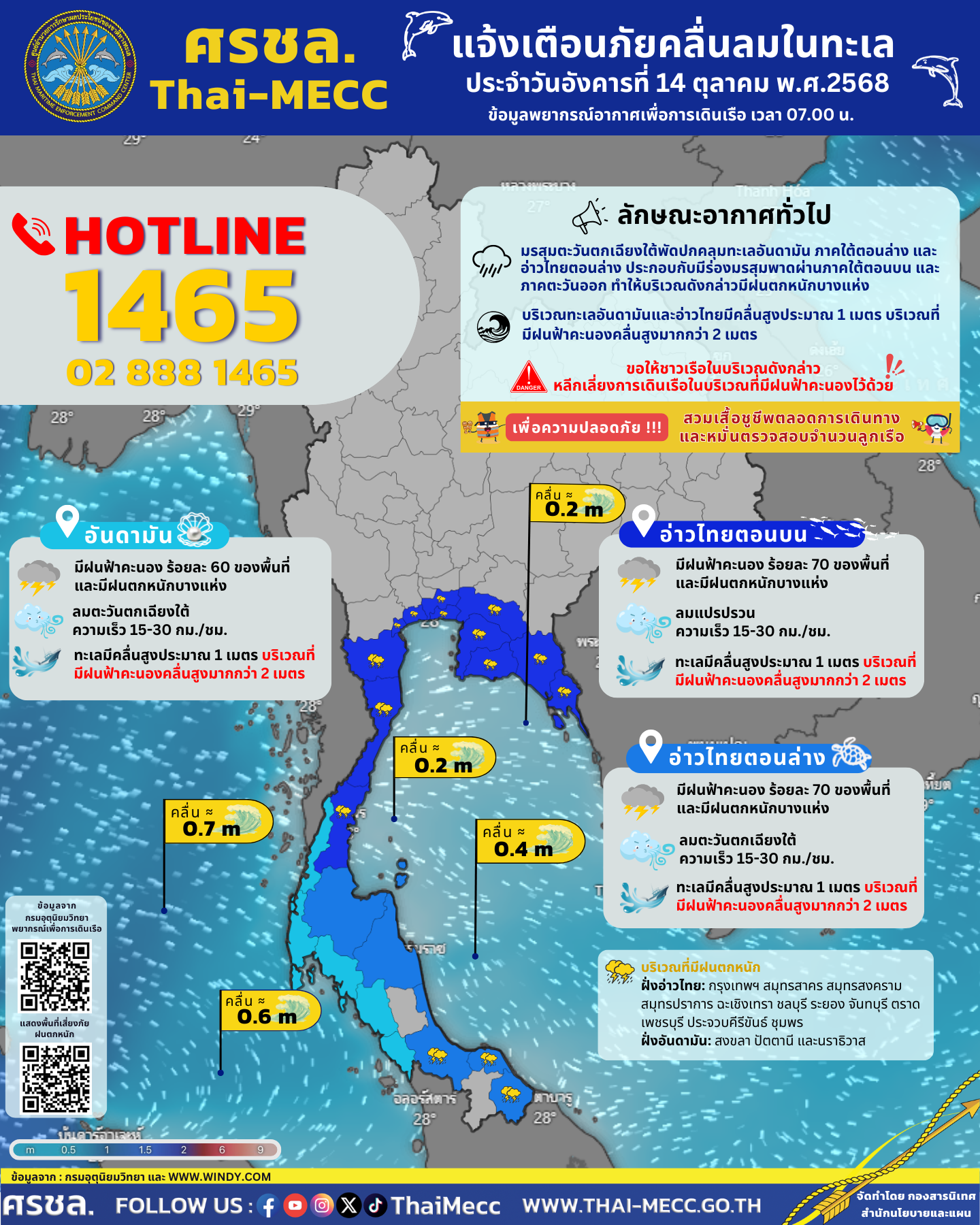 ประกาศ ศูนย์อำนวยการรักษาผลประโยชน์ของชาติทางทะเล เรื่อง แจ้งเตือนภัยคลื่นลมในทะเล ประจำวันอังคารที่ 14 ตุลาคม 2568
