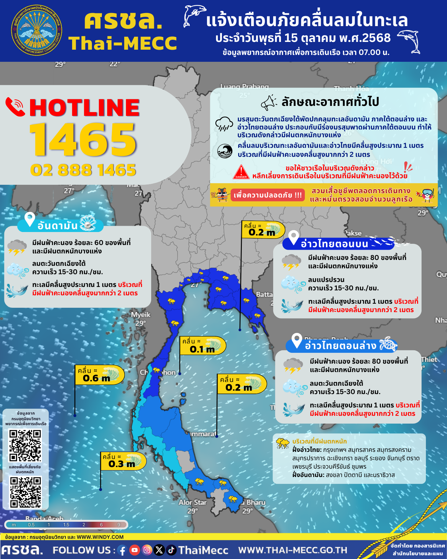 ประกาศ ศูนย์อำนวยการรักษาผลประโยชน์ของชาติทางทะเล เรื่อง แจ้งเตือนภัยคลื่นลมในทะเล ประจำวันพุธที่ 15 ตุลาคม 2568