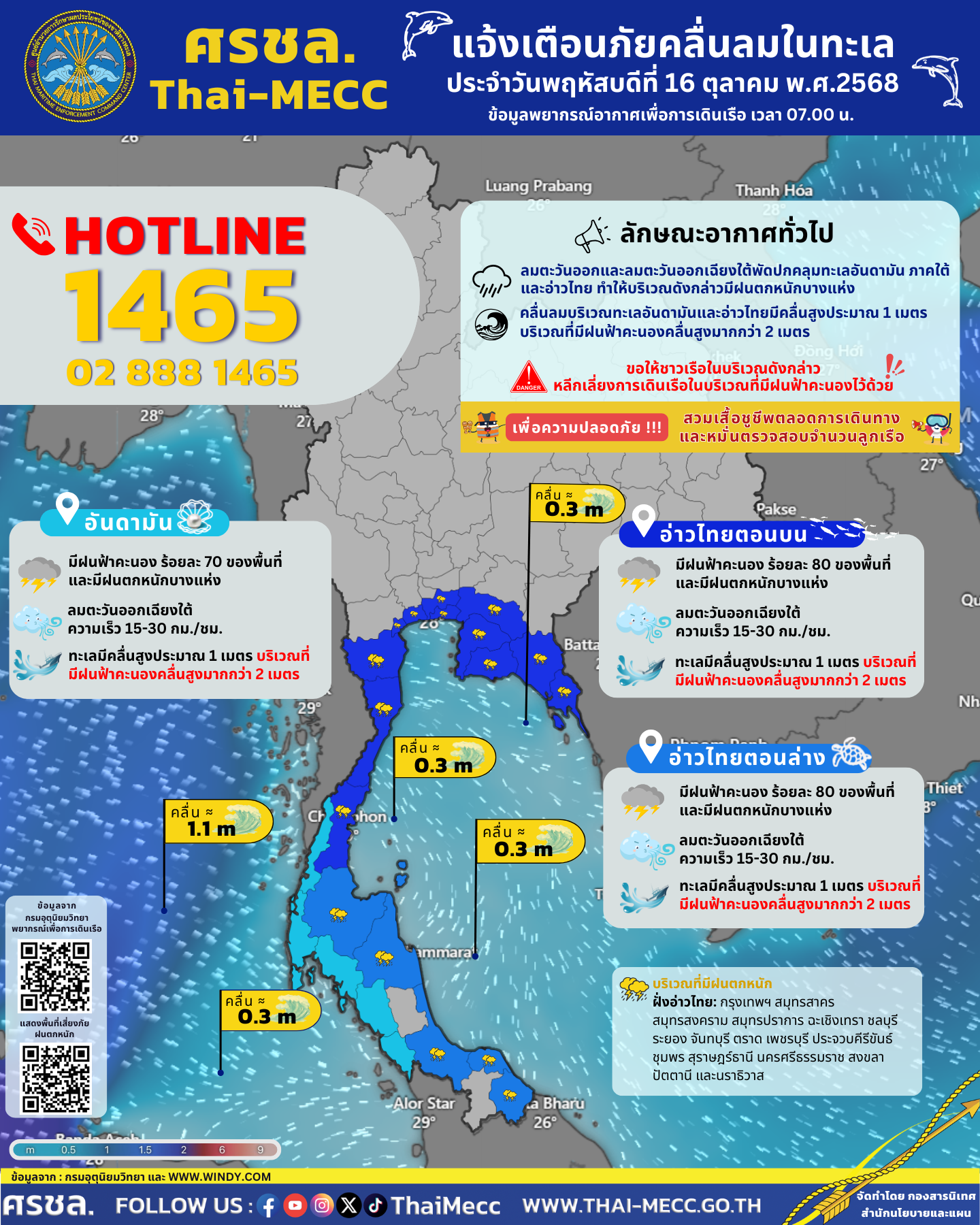 ประกาศ ศูนย์อำนวยการรักษาผลประโยชน์ของชาติทางทะเล เรื่อง แจ้งเตือนภัยคลื่นลมในทะเล ประจำวันพฤหัสบดีที่ 16 ตุลาคม 2568