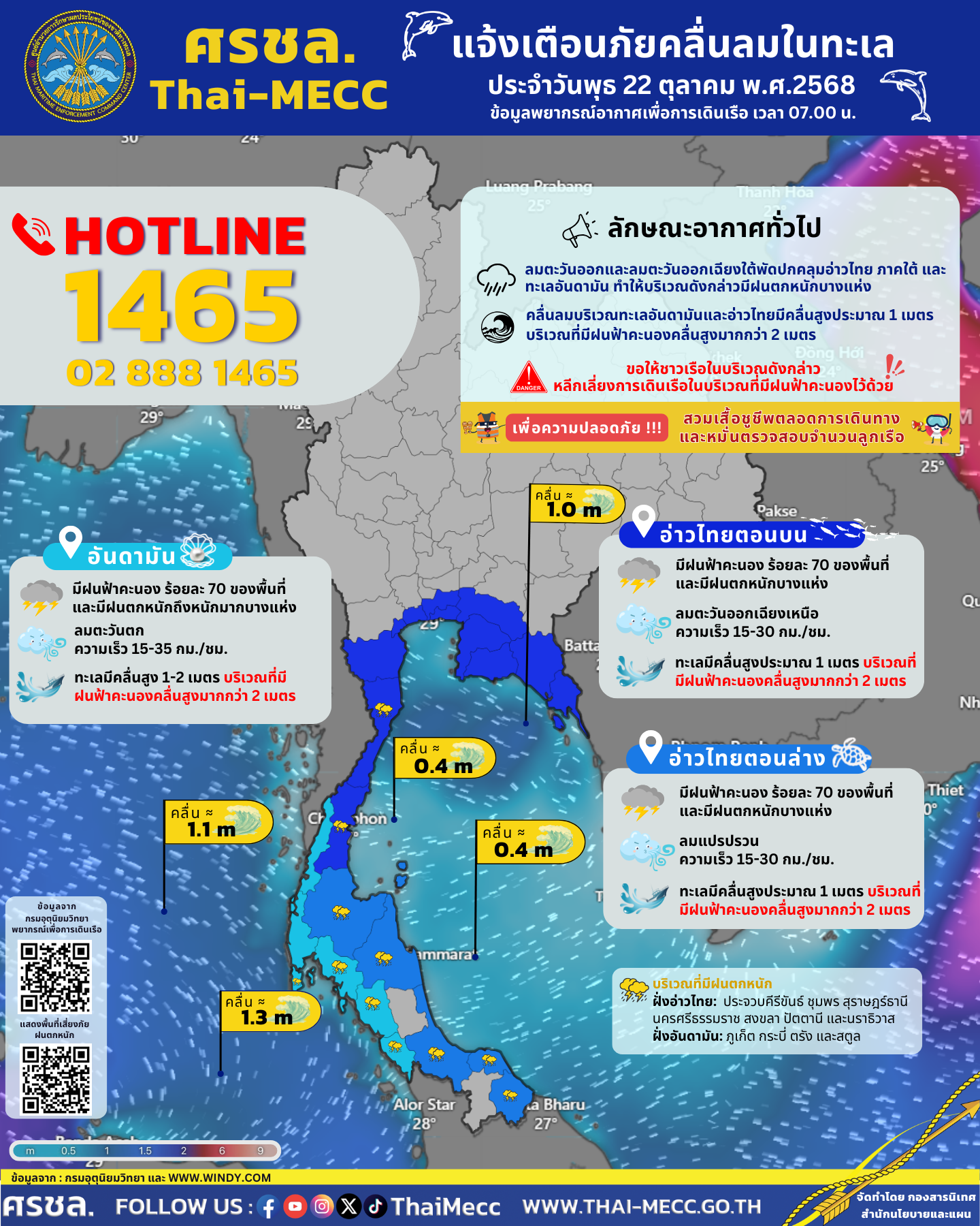 ประกาศ ศูนย์อำนวยการรักษาผลประโยชน์ของชาติทางทะเล เรื่อง แจ้งเตือนภัยคลื่นลมในทะเล ประจำวันพุธที่ 22 ตุลาคม 2568