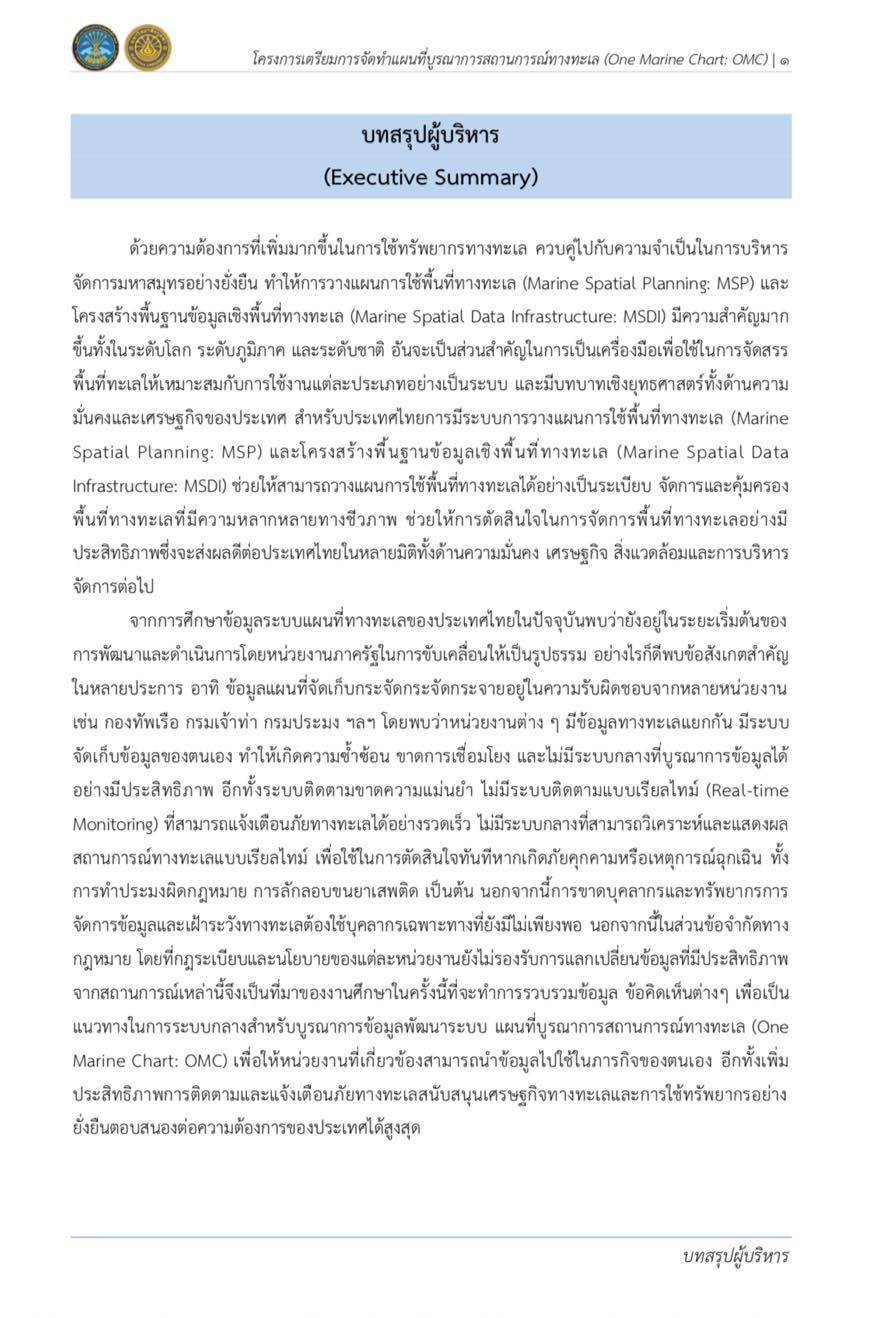 โดยที่ประชุมได้สรุปความจำเป็นและแนวทางดำเนินการของ One Marine Chart (OMC) เพื่อให้ประเทศไทยมีการบริหารจัดการพื้นที่ทางทะเลเป็นหนึ่งเดียวอย่างเป็นระบบ รวมถึงการมีระบบการวางแผนการใช้พื้นที่ทางทะเล (Marine Spatial Planning: MSP) และโครงสร้างพื้นฐานข้อมูลเชิงพื้นที่ทางทะเล (Marine Spatial Data Infrastructure: MSDI) ช่วยให้สามารถวางแผนการใช้พื้นที่ทางทะเลได้อย่างเป็นระเบียบ จัดการและคุ้มครองพื้นที่ทางทะเลที่มีความหลากหลายทางชีวภาพ ช่วยให้การตัดสินใจในการจัดการพื้นที่ทางทะเลอย่างมีประสิทธิภาพซึ่งจะส่งผลดีต่อประเทศไทยในหลายมิติทั้งด้านความมั่นคง เศรษฐกิจ สิ่งแวดล้อมและการบริหารจัดการต่อไป โดยใช้รูปแบบของประเทศต่างๆมาประยุกต์ใช้กับบริบททางข้อกฎหมายของประเทศไทย