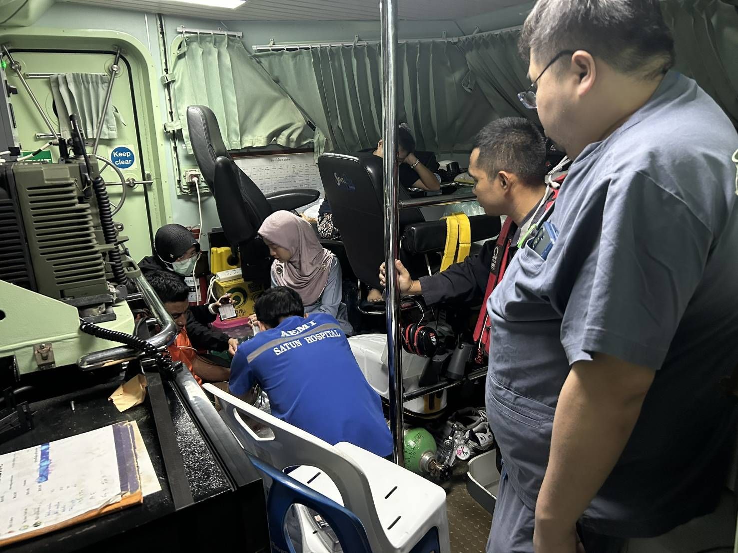 📍ศรชล.จว.สตูล ประสานทีมแพทย์ สพฉ.สตูล เพื่อให้มาขึ้นเรือที่สถานีเรือละงู และเมื่อเวลา 20:30 น. ศรชล.จว.สตูล, ศคท.จว.สตูล, พร้อมทีมแพทย์ฉุกเฉิน รพ.สตูล เริ่มปฏิบัติภารกิจส่งกลับสายแพทย์ ออกเดินทางด้วย เรือ ต.273 ไปยังเกาะหลีเป๊ะ ระยะทาง 48 ไมล์ ฝ่าความมืดและคลื่นลมแรง จนกระทั่งเวลา 23:30 น. เดินทางถึงเกาะหลีเป๊ะ ทำการรับตัวผู้ป่วยฉุกเฉินขึ้นเรือและเดินทางกลับเข้าฝั่งตามเส้นทางเดิม ตลอดเวลาที่เดินทางกลับเข้าฝั่งผู้ป่วยได้รับการดูแลจากทีมแพทย์ฉุกเฉินเป็นอย่างดี