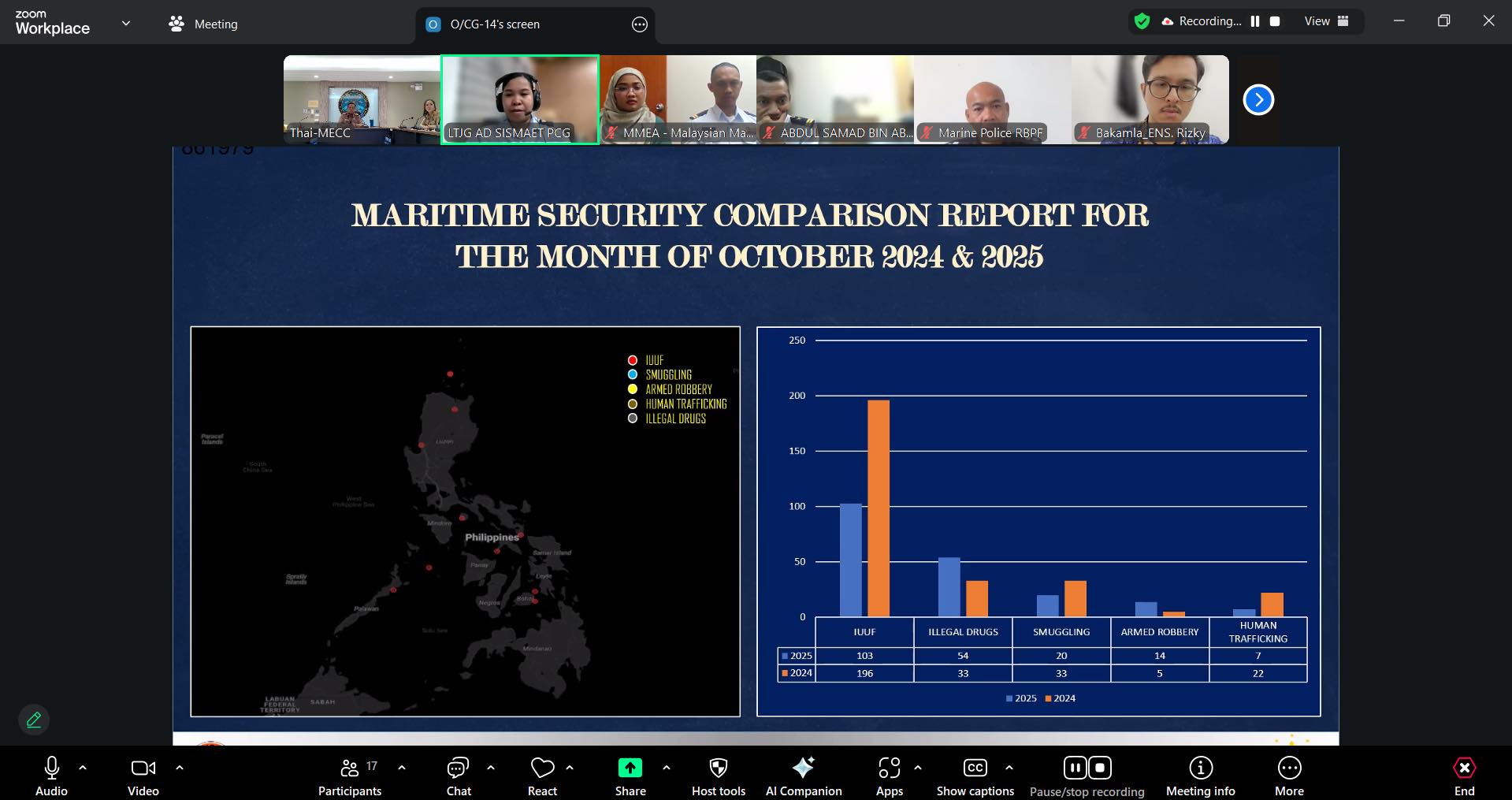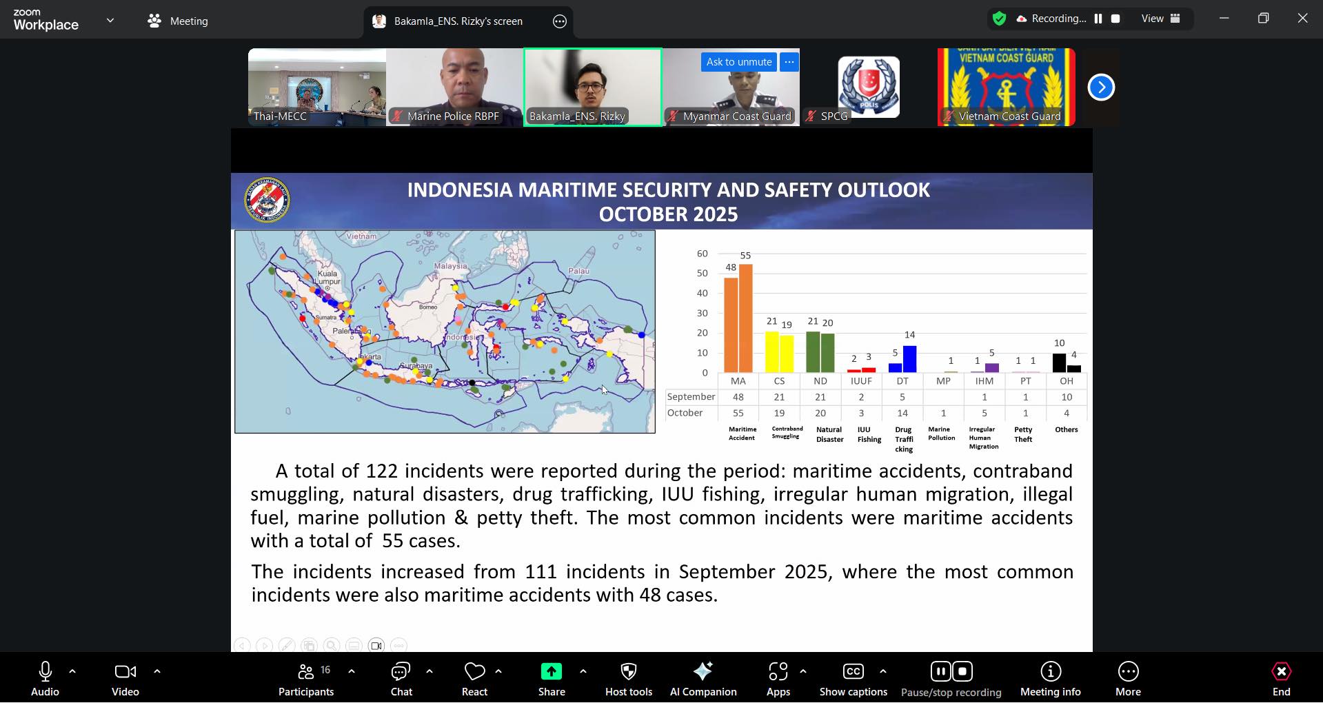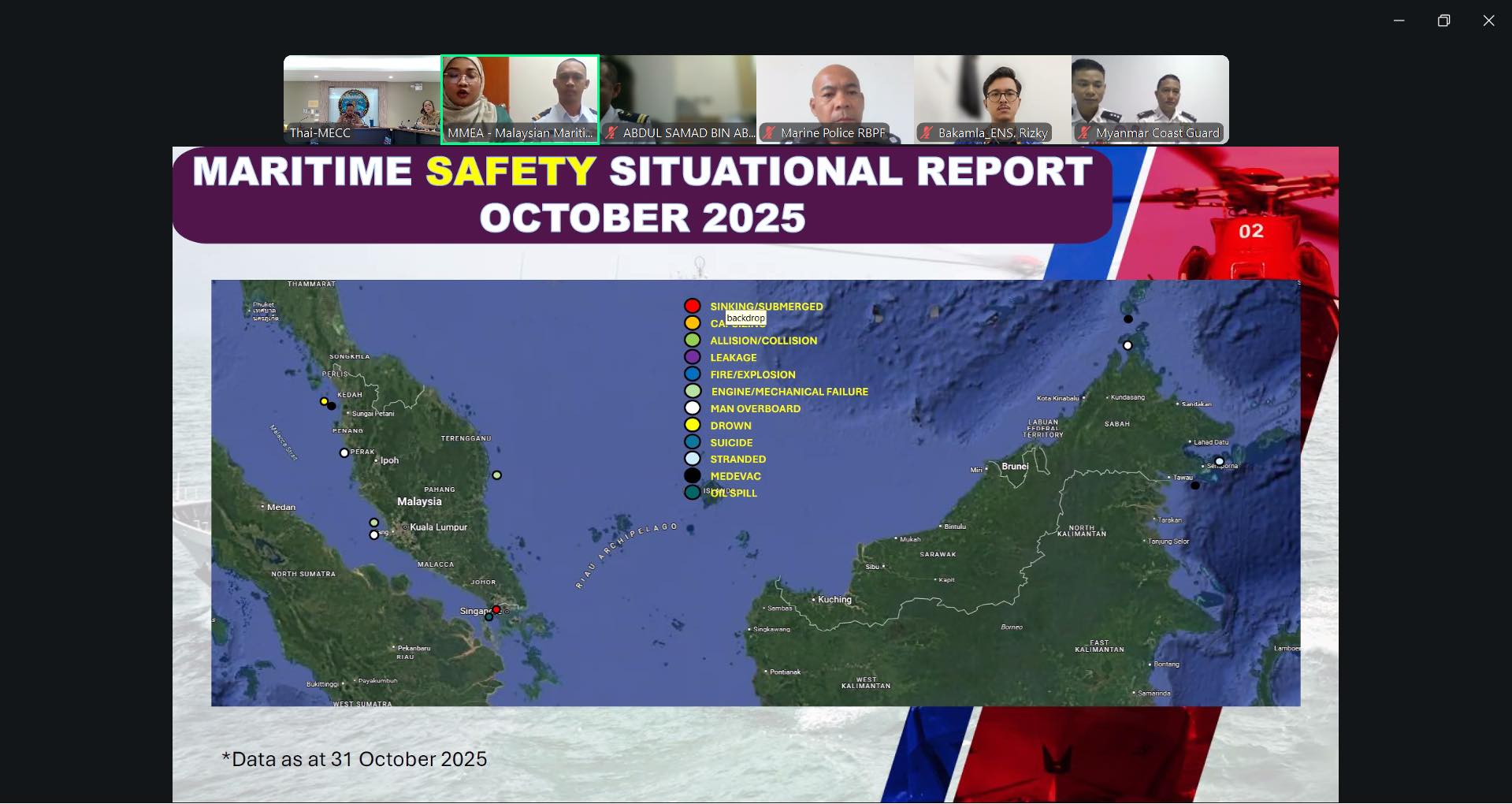การประชุมในครั้งนี้ มีวัตถุประสงค์เพื่อเสริมสร้างความร่วมมือด้านความมั่นคงและความปลอดภัยทางทะเลร่วมกับหน่วยยามฝั่งของประเทศสมาชิกอาเซียน ตลอดจนยกระดับศักยภาพในการแลกเปลี่ยนข้อมูลข่าวสารทางทะเลอย่างมีประสิทธิภาพ โดยมีผู้แทนจากหน่วยยามฝั่งและหน่วยงานบังคับใช้กฎหมายทางทะเลเข้าร่วมการประชุมฯ จำนวน 9 ประเทศ ได้แก่ ประเทศบรูไน ประเทศอินโดนีเซีย ประเทศมาเลเซีย ประเทศฟิลิปปินส์ ประเทศลาว ประเทศเมียนมา ประเทศเวียดนาม ประเทศสิงคโปร์ และประเทศไทย ทั้งนี้ ประเทศสมาชิกได้มีการแลกเปลี่ยนข้อมูลสถิติด้านความมั่นคงและความปลอดภัยทางทะเล ประจำเดือนตุลาคม 2568 ดังนี้