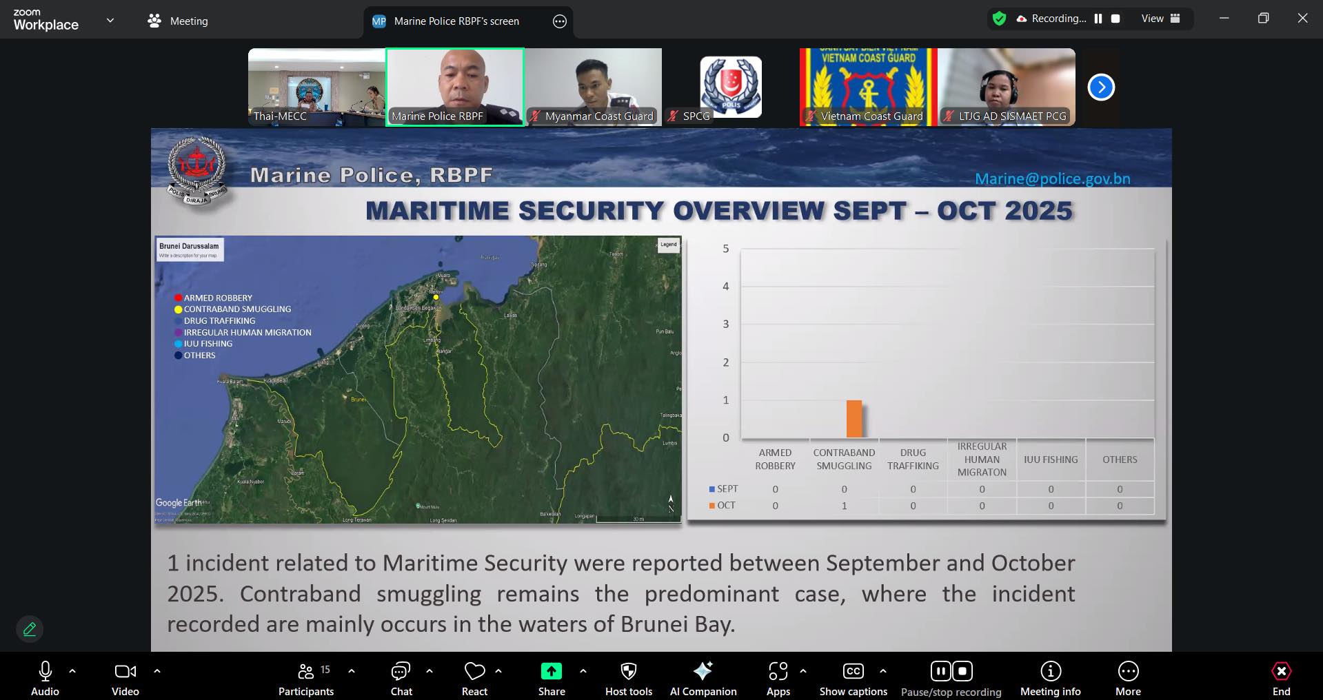 - ประเทศบรูไน รายงานเหตุการณ์สถิติเหตุการณ์ด้านความมั่นคงทางทะเล จำนวน 1 เหตุการณ์ คือ การลักลอบขนส่งสินค้าผิดกฎหมาย ประเภทเครื่องดื่มแอลกอฮอล์ และไม่พบเหตุการณ์ด้านความปลอดภัยทางทะเลในห้วงเดือนตุลาคม 2568