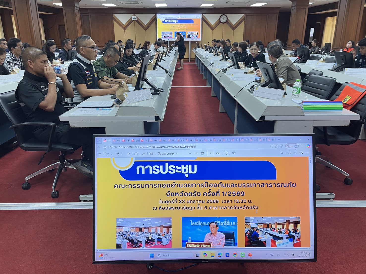 ในวันศุกร์ที่ 23 มกราคม 2569 เวลา 1330 ศรชล.ภาค 3 โดย น.อ.ดุสิต จันทร์ราช รอง ผอ.ศรชล.จว.ตรัง เข้าร่วมประชุมคณะกรรมการกองอำนวยการป้องกันและบรรเทาสาธารณภัยจังหวัดตรัง ครั้งที่ 1/2569 เพื่อติดตามสถานการณ์ไฟป่า หมอกควันและฝุ่นละอองขนาดเล็ก (PM 2.5) สถานการณ์ภัยแล้ง และร่วมพิจารณาแผนเผชิญเหตุสาธารณภัย ประจำปี ๒๕๖๙ จังหวัดตรัง ณ ห้องพระยารัษฎา ศาลากลางจังหวัดตรัง โดยมี นายทรงกลด สว่างวงศ์ ผู้ว่าราชการจังหวัดตรัง เป็นประธานการประชุมฯ ผลการปฏิบัติเป็นไปด้วยความเรียบร้อย