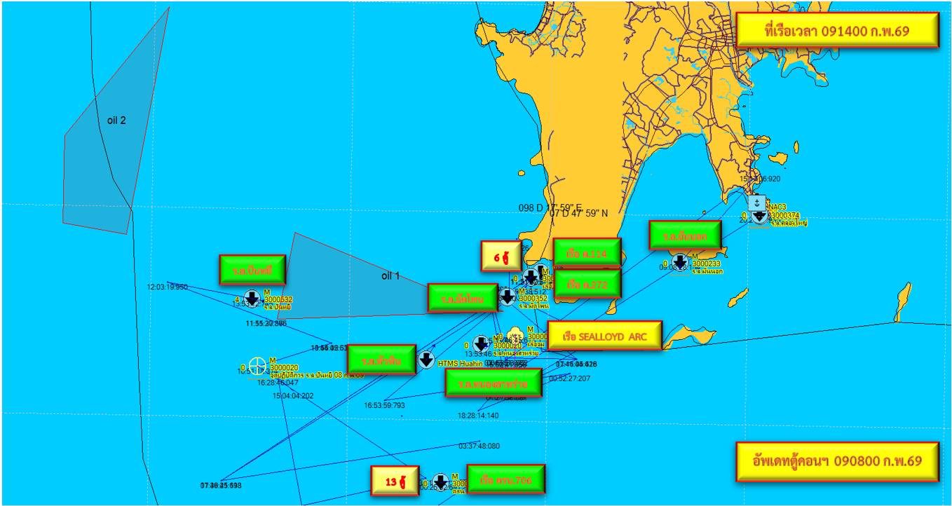 เมื่อวันที่ 9 ก.พ.69 ศูนย์บัญชาการเหตุการณ์ กรณีเรือขนส่งสินค้า SEALLOYD ARC อับปาง จัดประชุมติดตามและประเมินสถานการณ์ และกำหนดแผนการปฏิบัติ โดยมี พลเรือโท วีรุดม ม่วงจีน ผอ.ศรชล.ภาค 3/ผู้บัญชาการเหตุการณ์ฯ เป็นประธานการประชุม โดยมี รองอธิบดีกรมเจ้าท่า เข้าร่วมประชุม เพื่อรับทราบผลการปฏิบัติที่ผ่านมา และนำปัญหา อุปสรรค ข้อขัดข้อง มาประเมินเพื่อกำหนดแผนการปฏิบัติในวันที่ 9 ก.พ.69 ดังนี้