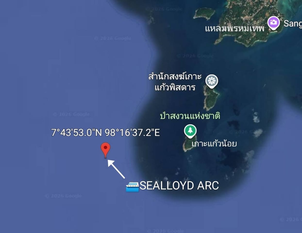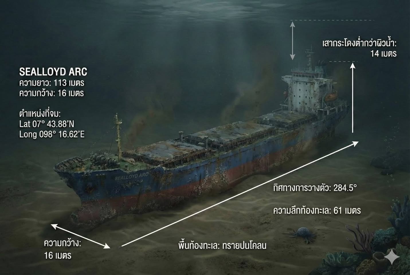 ➡️ ร.ล.หนองสาหร่าย ได้การค้นหาเรือ SEALLOYD ARC โดยโซน่า ตั้งแต่ช่วงเช้าจนกระทั่งเมื่อเวลา 12.00 น. ร.ล.หนองสาหร่าย ได้รายงานตรวจพบเรือ ”SEALLOYD ARC“ โดยมีรายละเอียด ดังนี้ ตรวจพบที่ความลึก 61 เมตร พื้นท้องทะเลเป็นทรายปนโคลน มีลักษณะการวางตัวเอียงเล็กน้อย เสากระโดงท้ายเรือต่ำกว่าผิวน้ำ 14 เมตร ทิศการวางตัวพาดยาว จากหัวเรือไปท้ายเรือทิศ 284.5 องศา