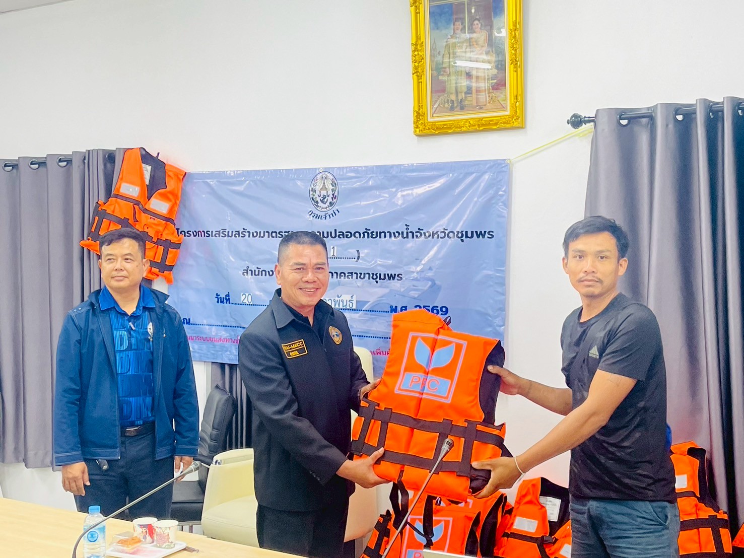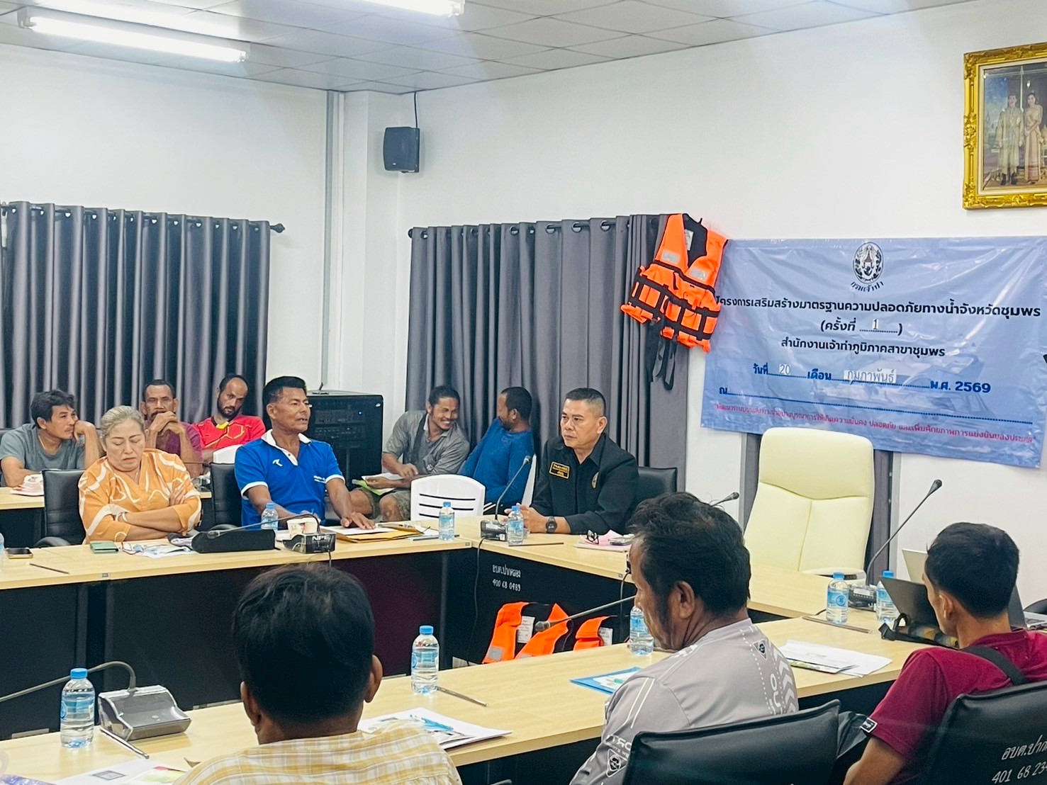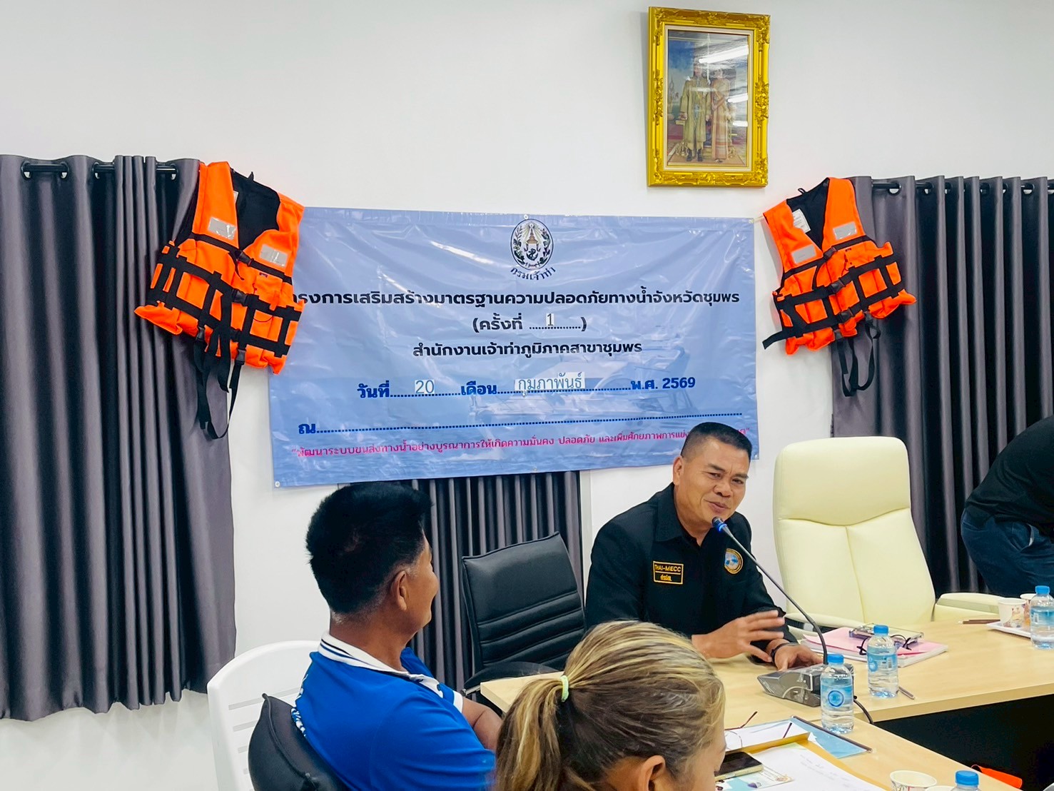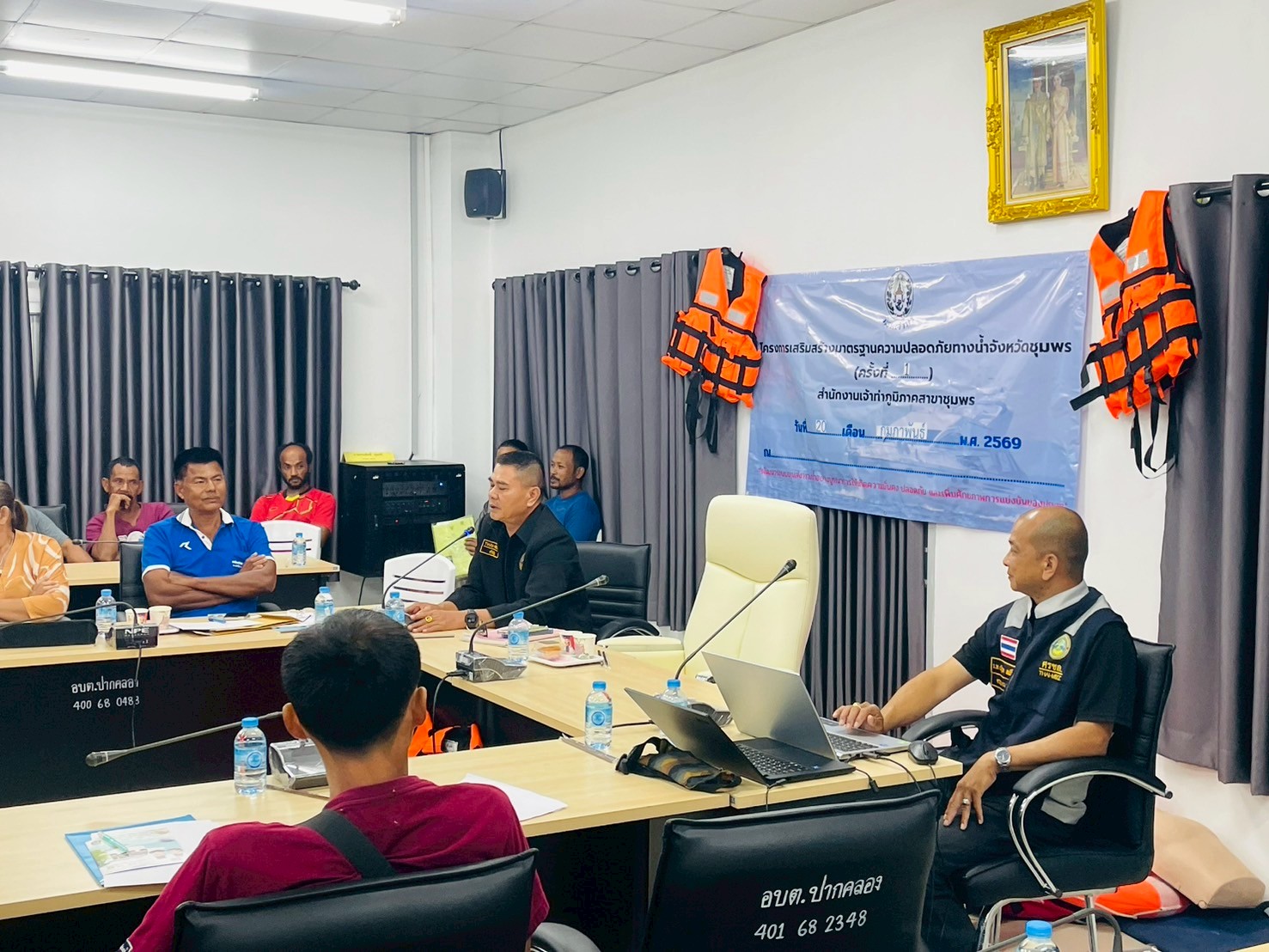 ในวันที่ 20 กุมภาพันธ์ 2569 เวลา 11.00 น. ศูนย์อำนวยการรักษาผลประโยชน์ของชาติทางทะเล จังหวัดชุมพร (ศรชล.จว.ชพ.) โดย นาวาเอก ชำนาญ สอนแพง รองผู้อำนวยการ ศรชล.จังหวัดชุมพร ได้รับเกียรติเป็นวิทยากรบรรยายในหัวข้อ "การดำรงชีพในทะเล" (Personal Survival Techniques Course) ภายใต้โครงการเสริมสร้างมาตรฐานความปลอดภัยทางน้ำจังหวัดชุมพร ครั้งที่ 1/2569 ณ ห้องประชุม อบต.ปากคลอง อำเภอปะทิว จังหวัดชุมพร